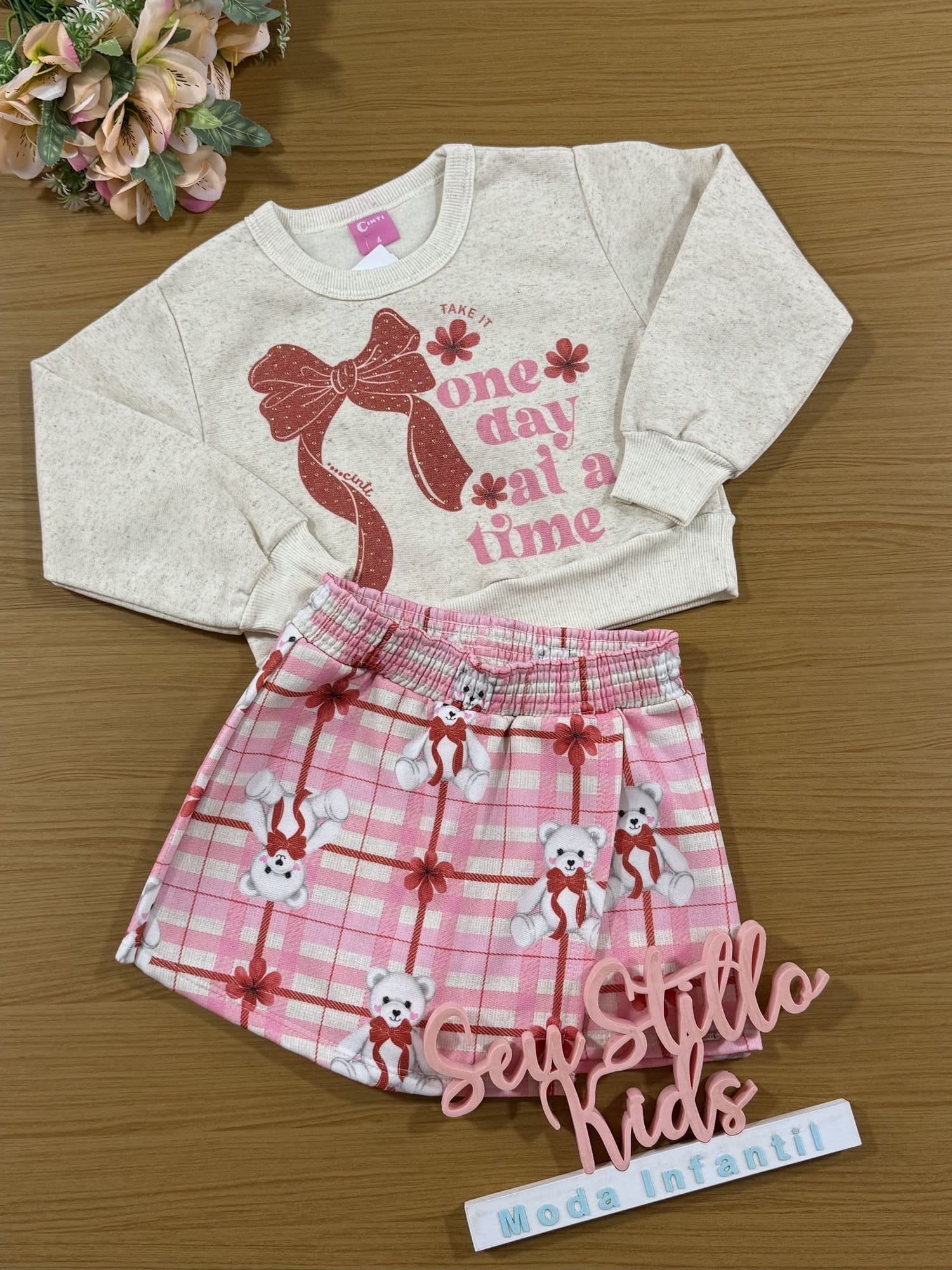 Conjunto Infantil Cinti Inverno Shorts Saia e Moletom Flanelado Laço