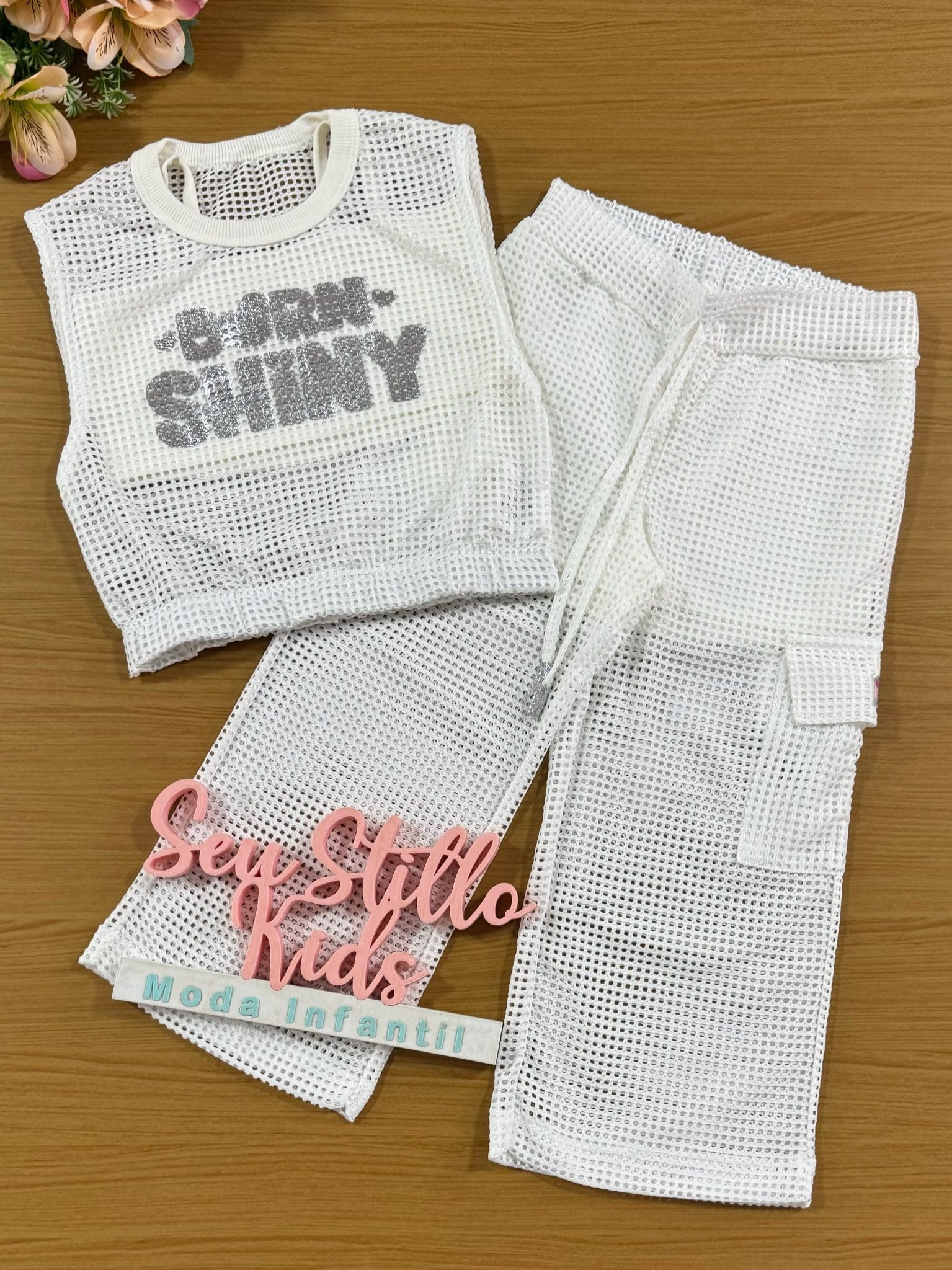 Conjunto Infantil Cinti Verão Calça, Top e Blusa Off White Telada
