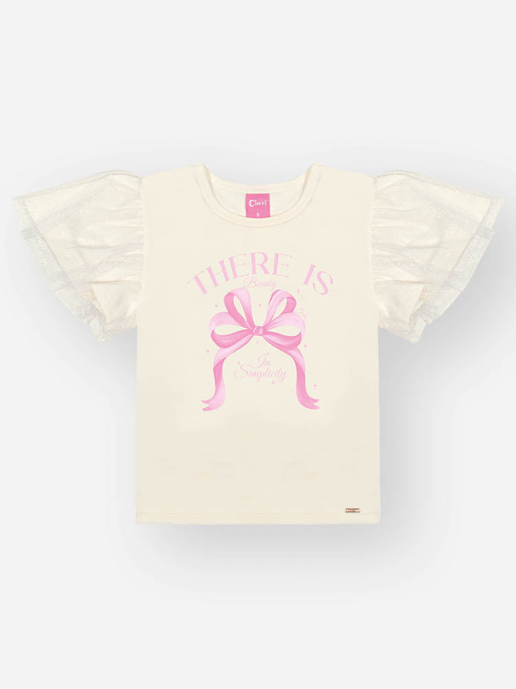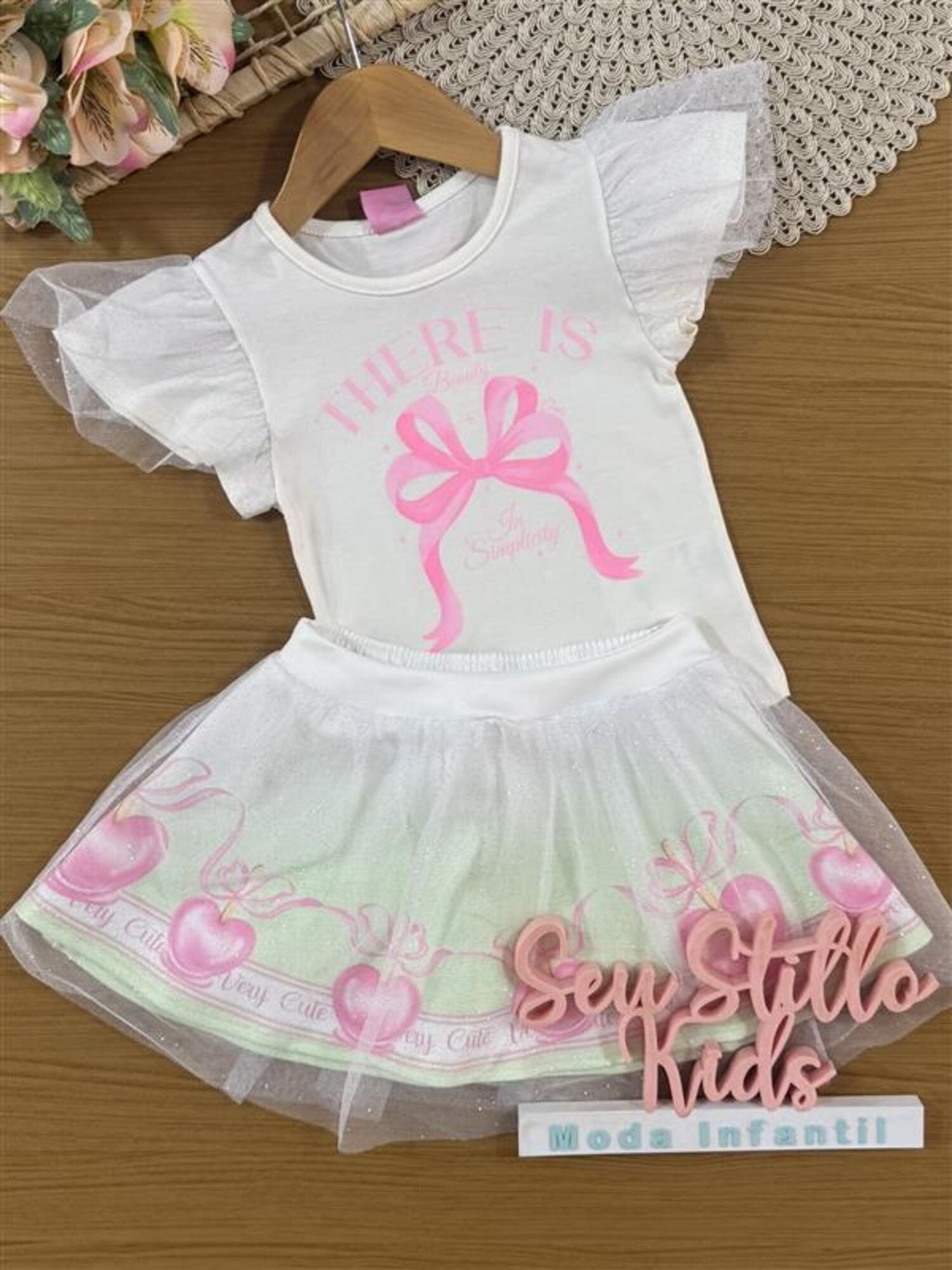 Conjunto Infantil Cinti Verão com Saia em Tule Verde e Blusa Branca Lacinho