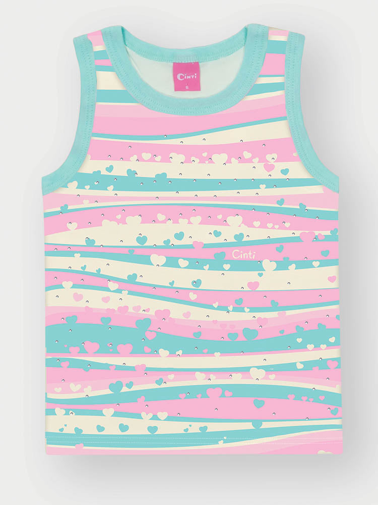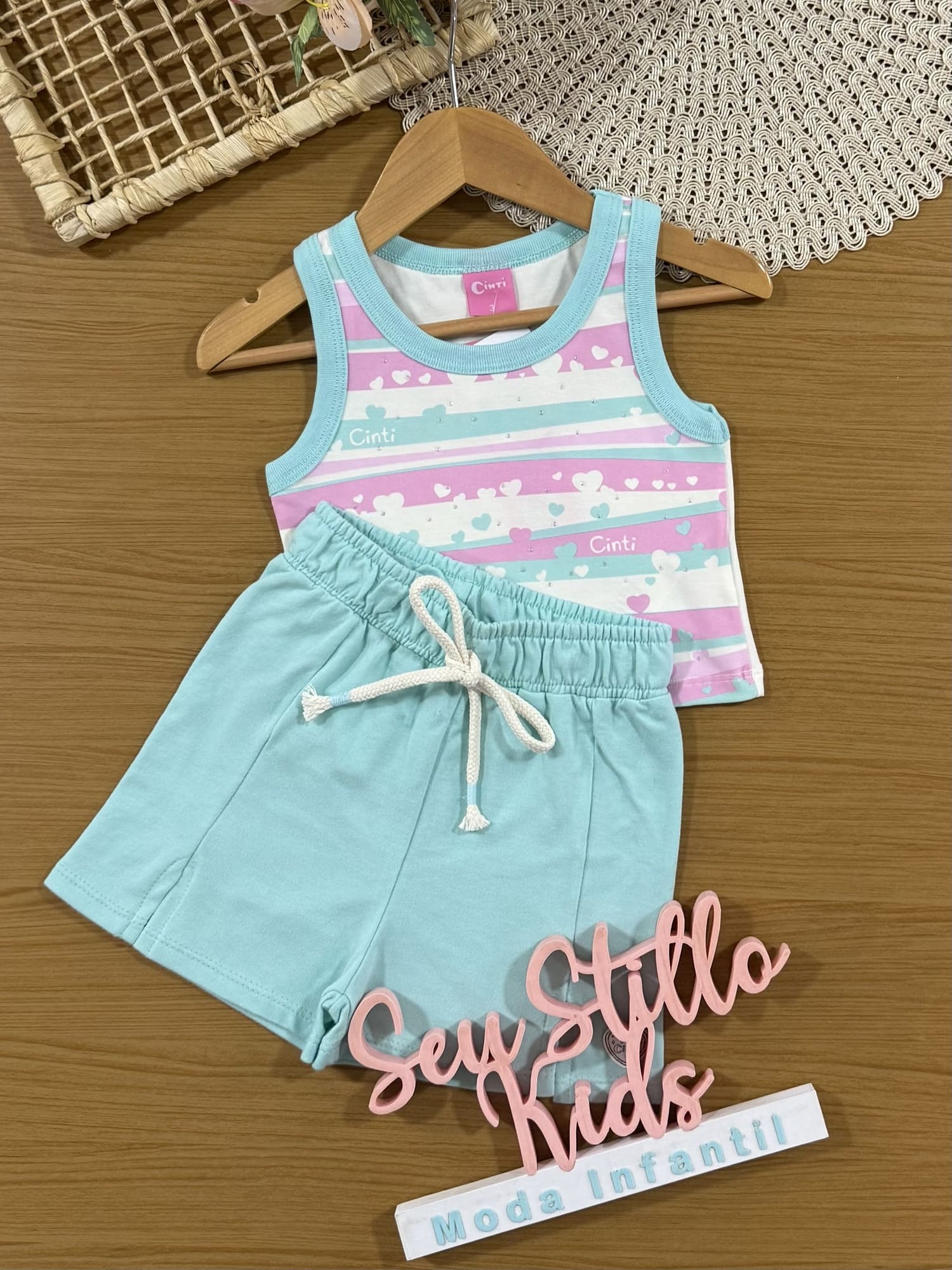 Conjunto Infantil Cinti Verão com Shorts Azul e Blusa Listrada Corações