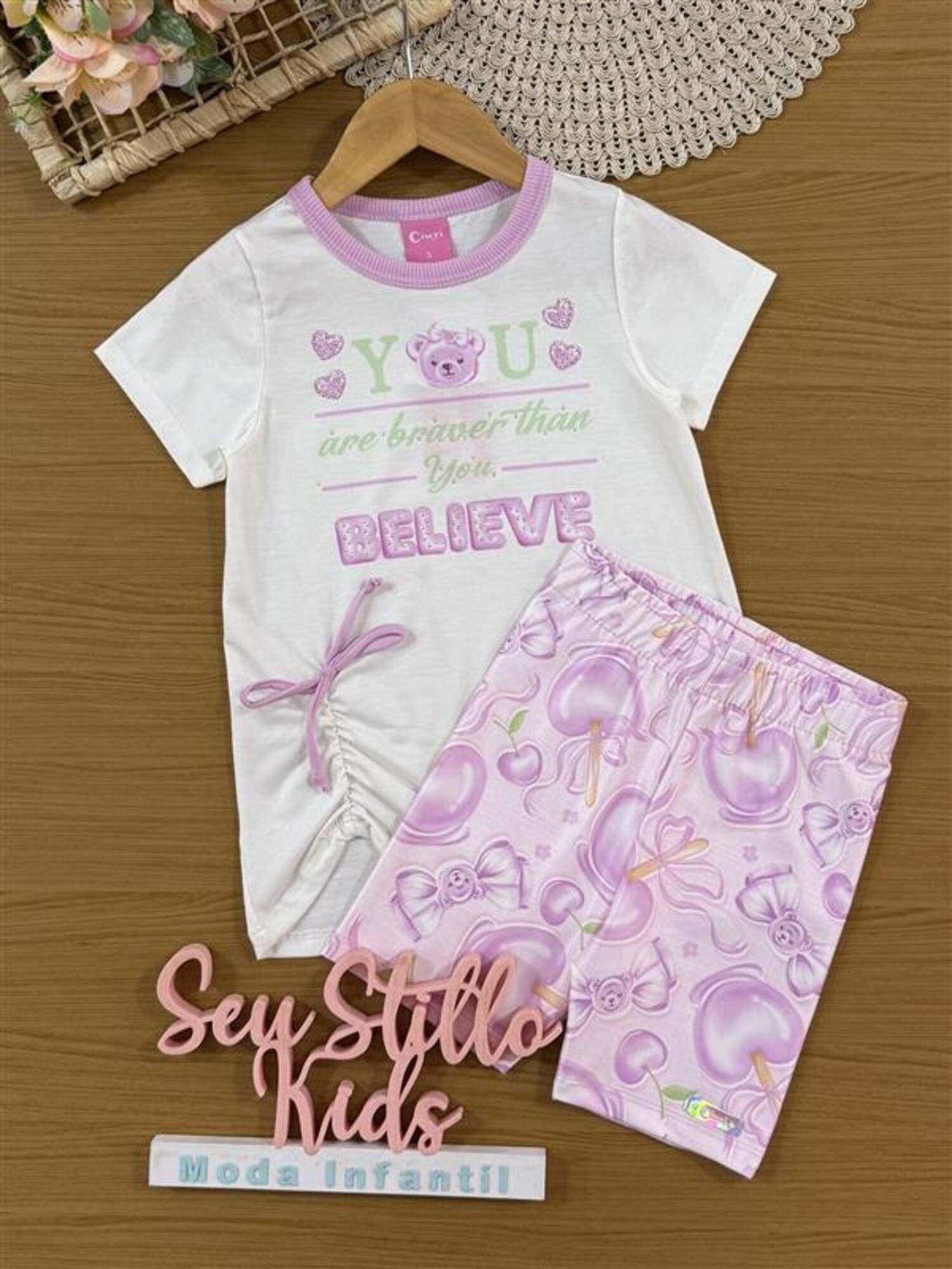 Conjunto Infantil Cinti Verão com Shorts Ciclista Lilás e Blusa Branca Ursinha Believe