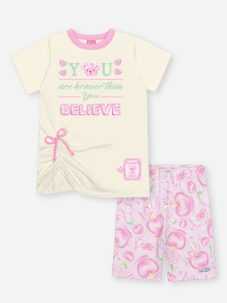 Conjunto Infantil Cinti Verão com Shorts Ciclista Rosa e Blusa Branca Ursinha Believe