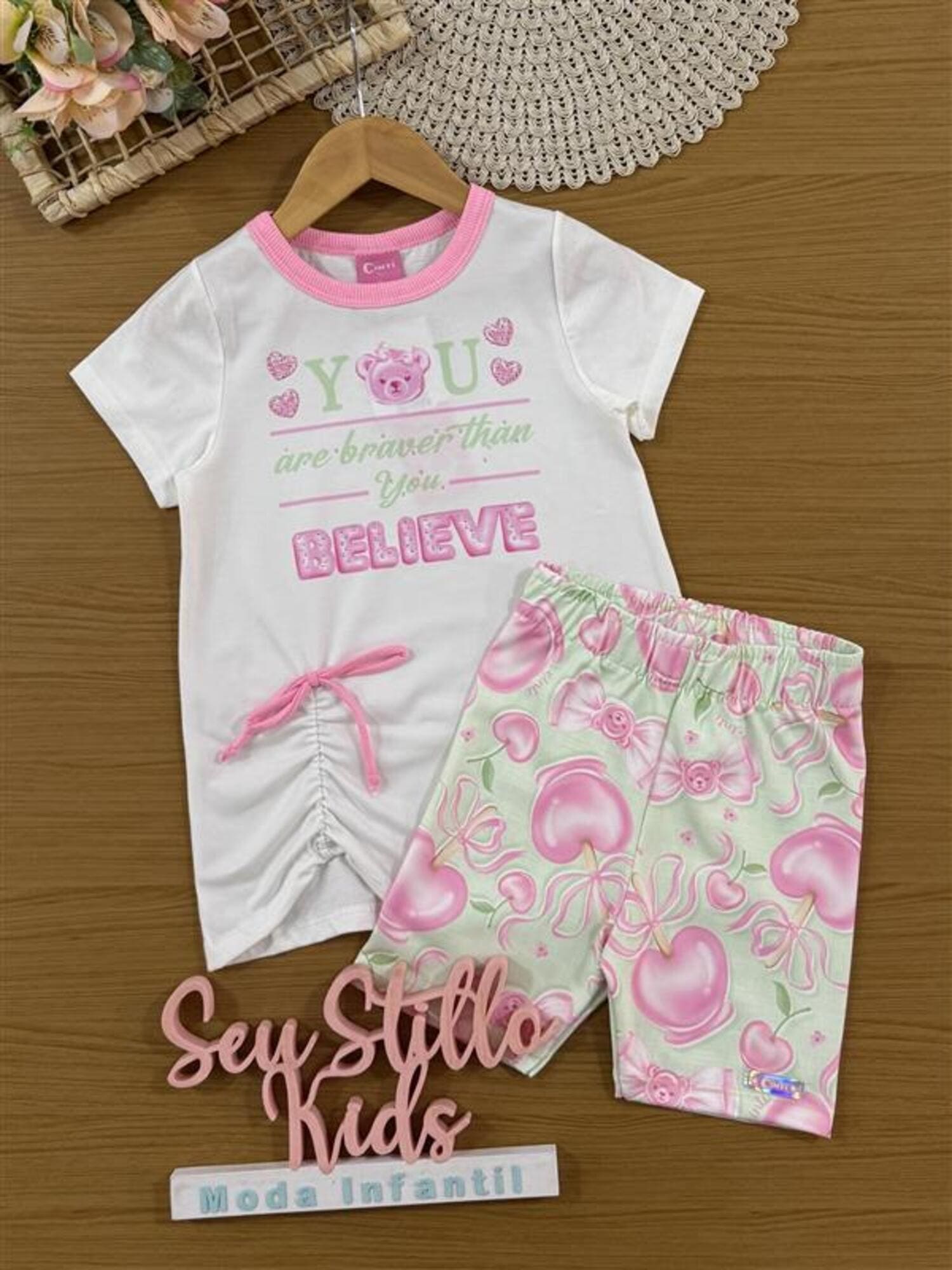 Conjunto Infantil Cinti Verão com Shorts Ciclista Verde e Blusa Branca Ursinha Believe