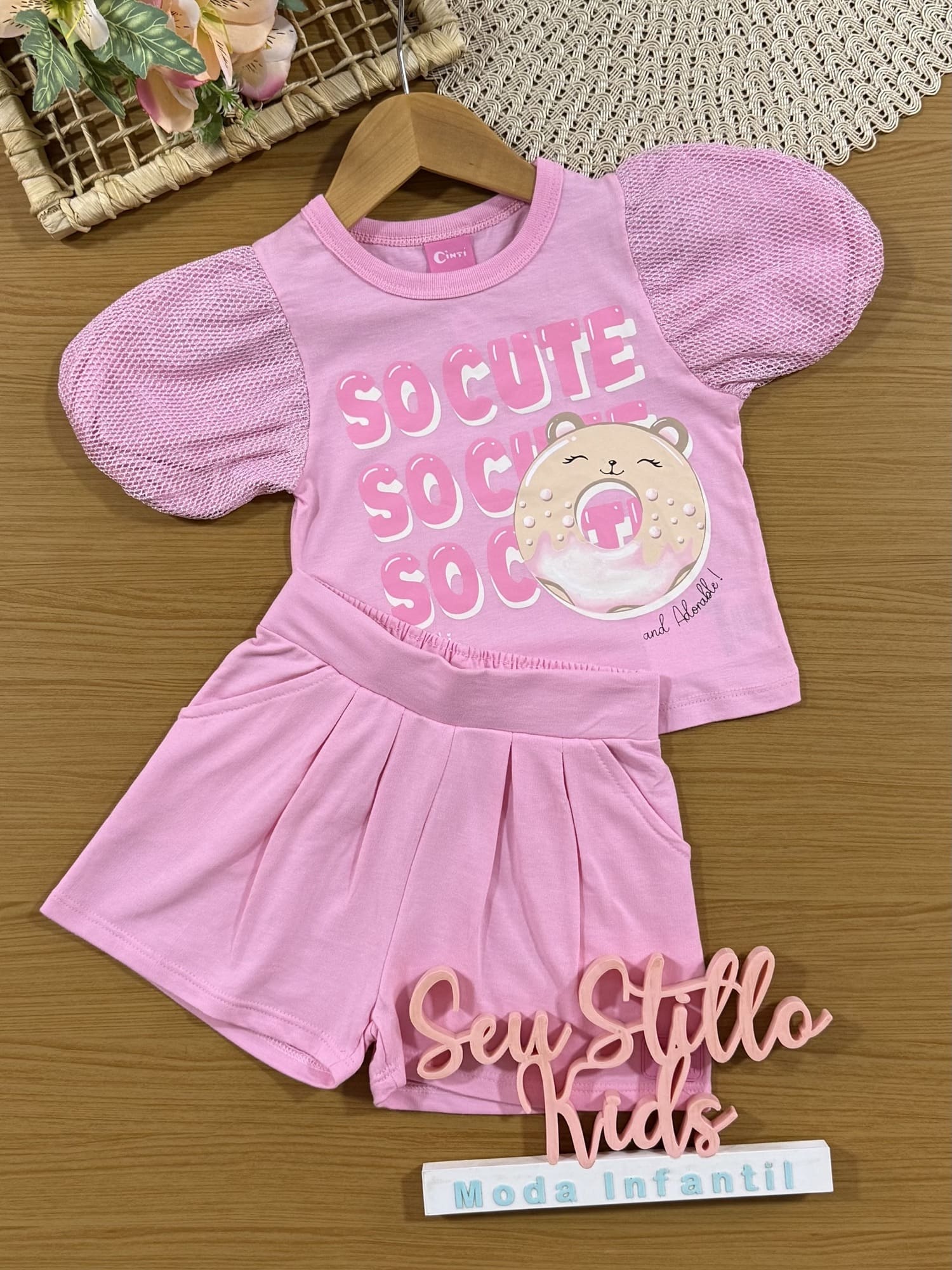 Conjunto Infantil Cinti Verão com Shorts e Blusa Rosa com Manga em Tela Cute