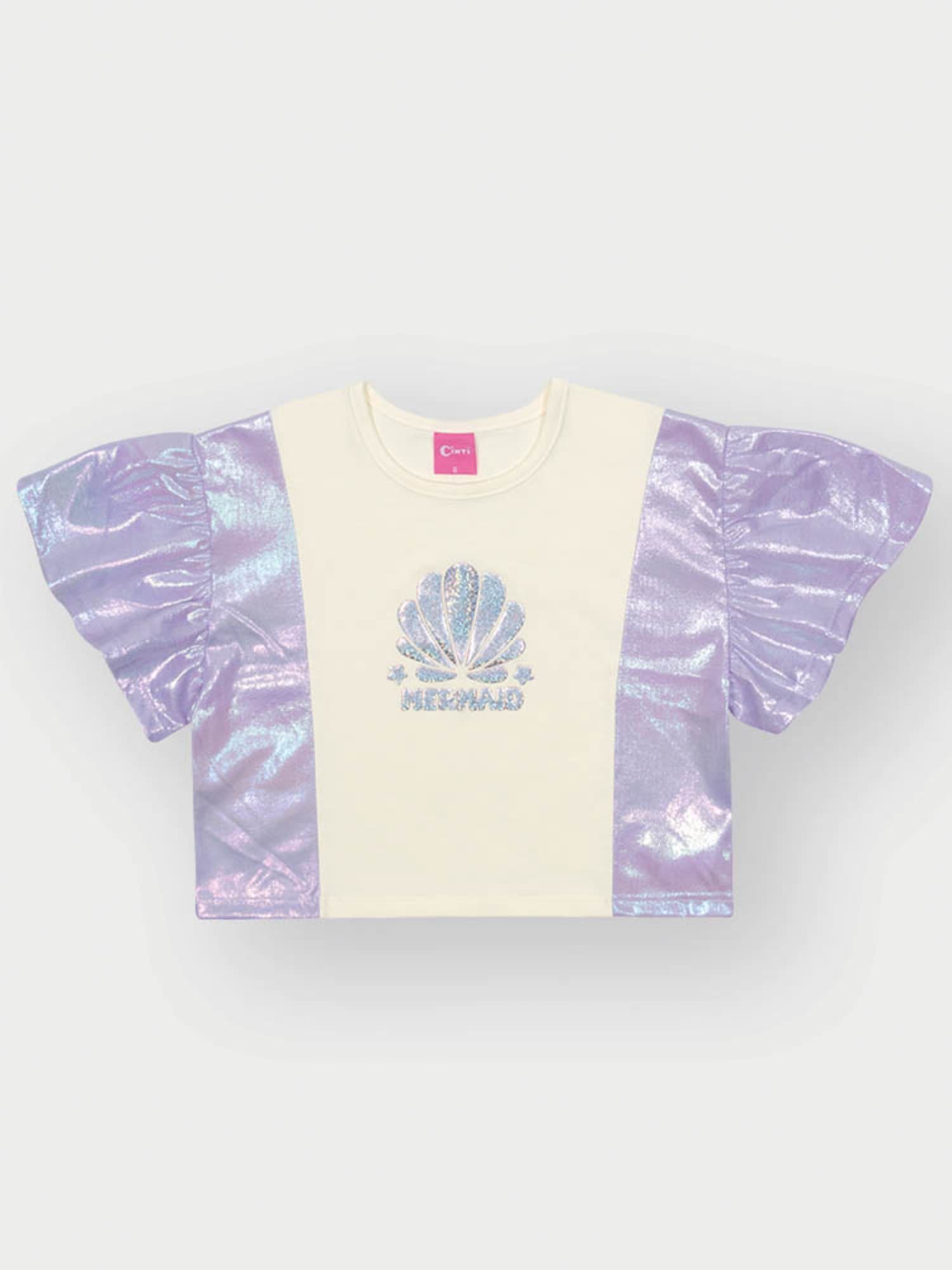 Conjunto Infantil Cinti Verão com Shorts Lilás e Blusa Branca Conchinha