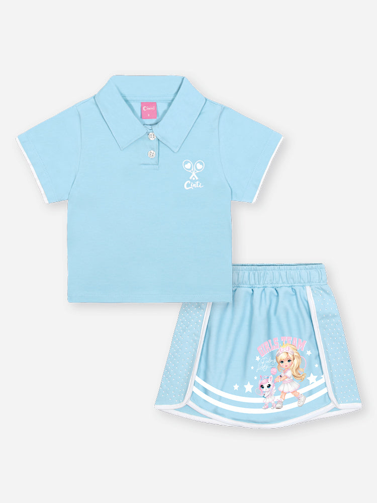 Conjunto Infantil Cinti Verão com Shorts Saia e Blusa Azul Tênista