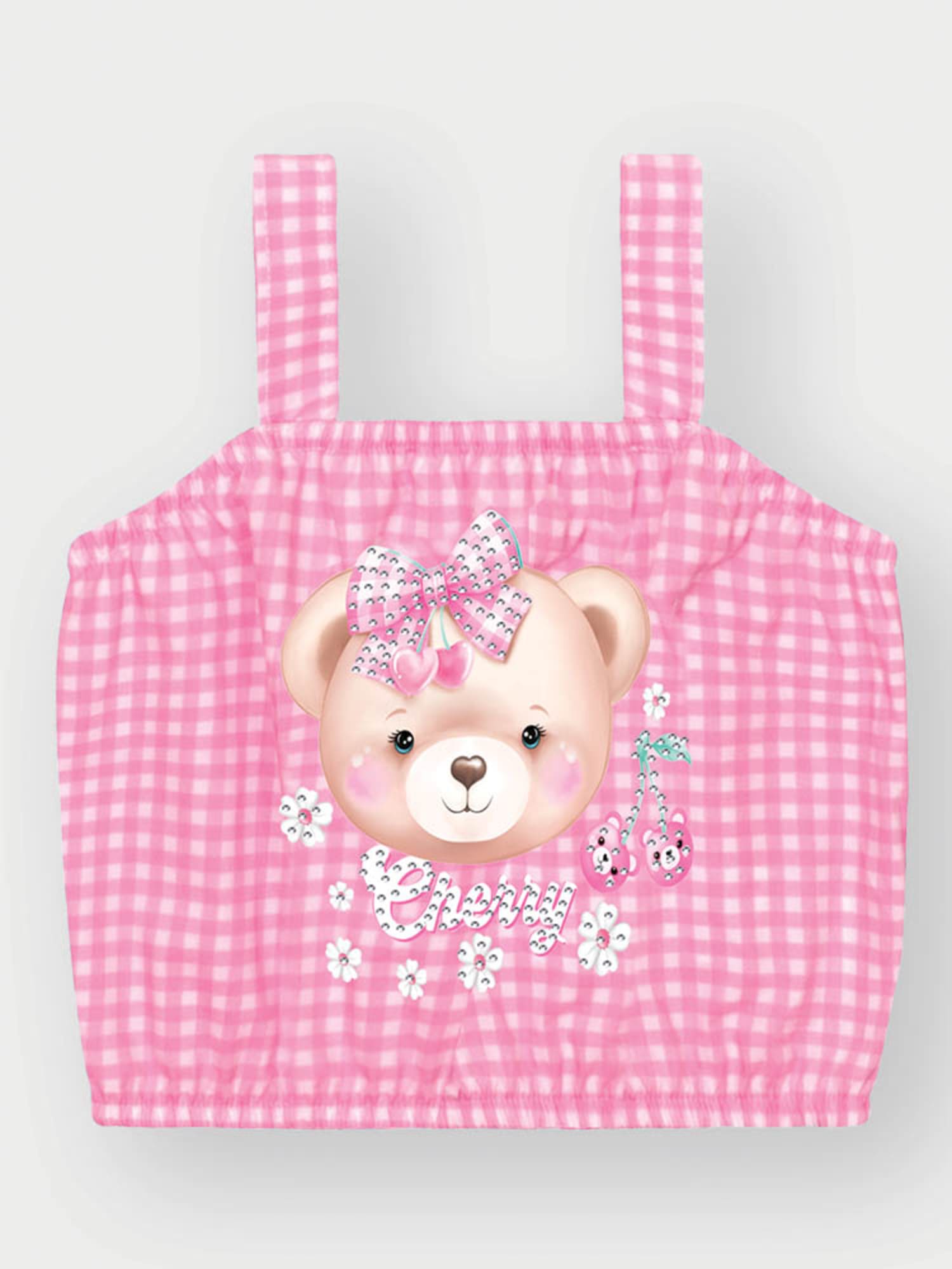 Conjunto Infantil Cinti Verão com Shorts Saia e Cropped Xadrez Rosa Ursinha
