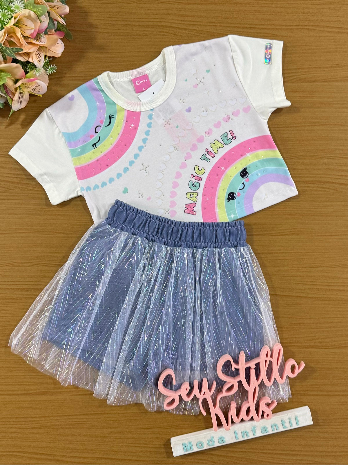 Conjunto Infantil Cinti Verão Saia Tule e Blusa Arco Íris