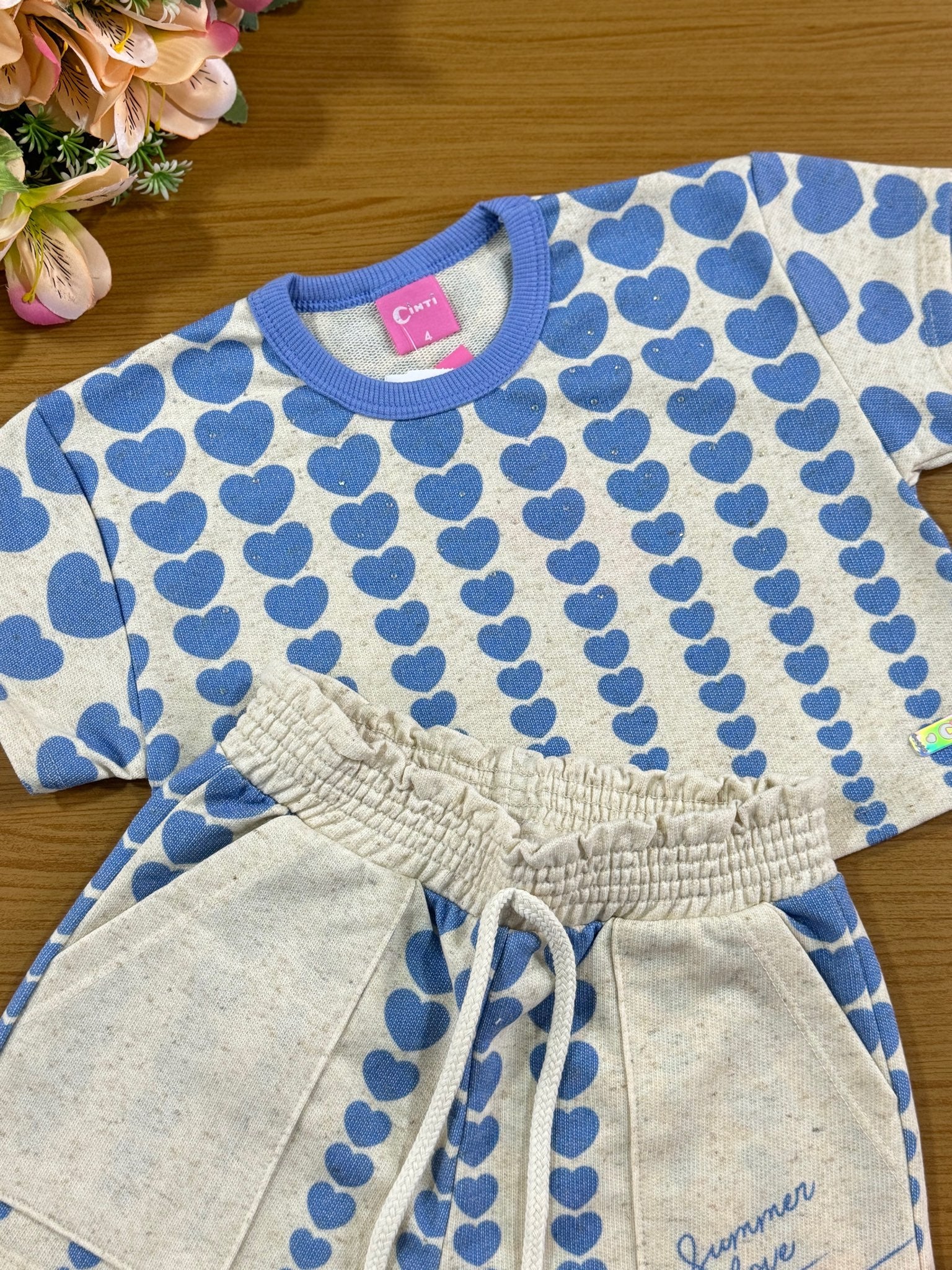 Conjunto Infantil Cinti Verão Shorts e Blusa Boxy Azul Coração
