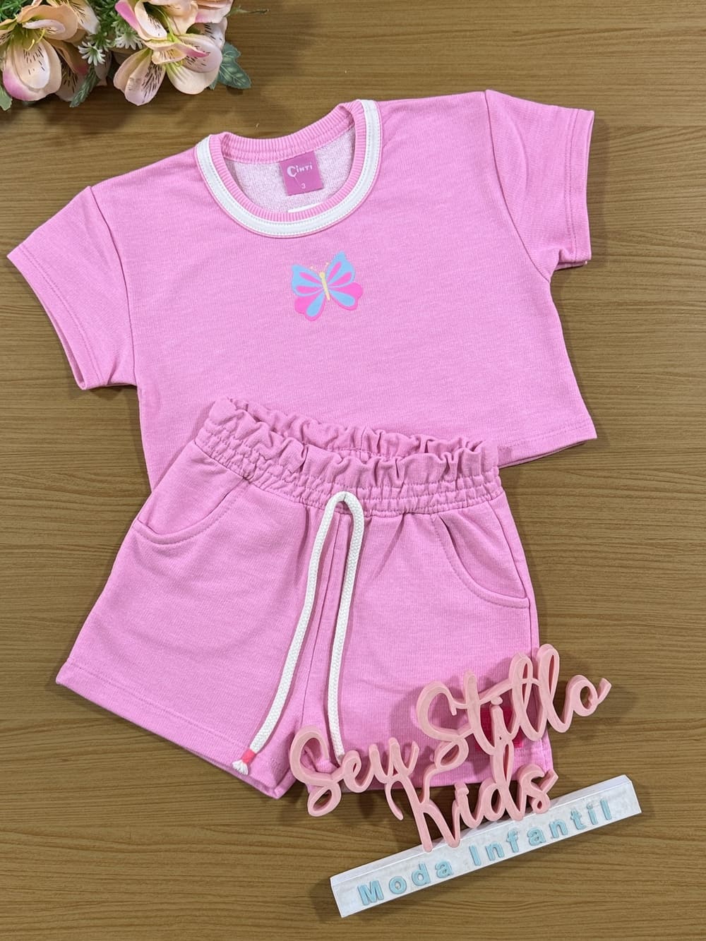 Conjunto Infantil Cinti Verão Shorts e Blusa Rosa Borboletinha