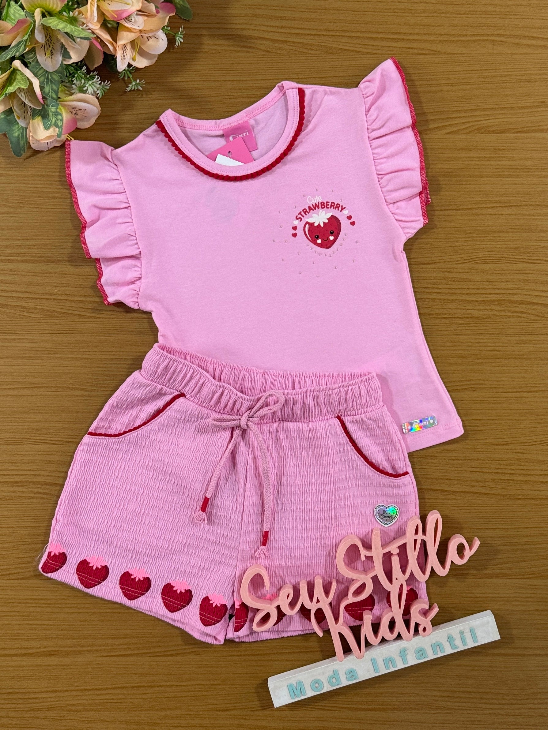 Conjunto Infantil Cinti Verão Shorts e Blusa Rosa Moranguinho