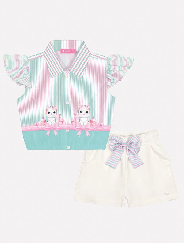 Conjunto Infantil Cinti Verão Shorts e Camisete Gatinha