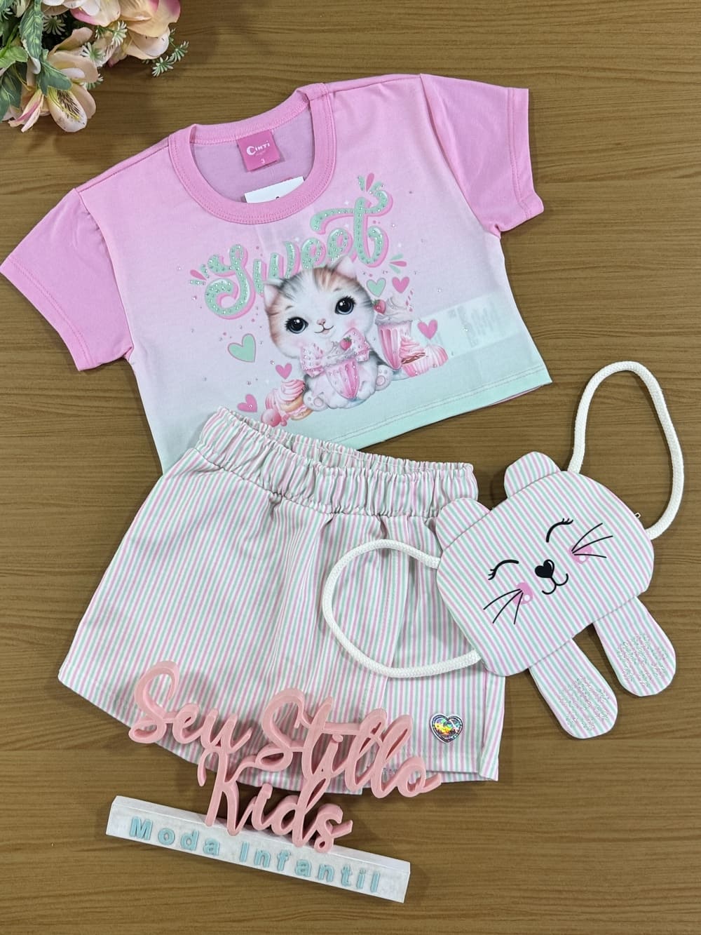 Conjunto Infantil Cinti Verão Shorts Saia e Blusa Gatinha Com Bolsinha