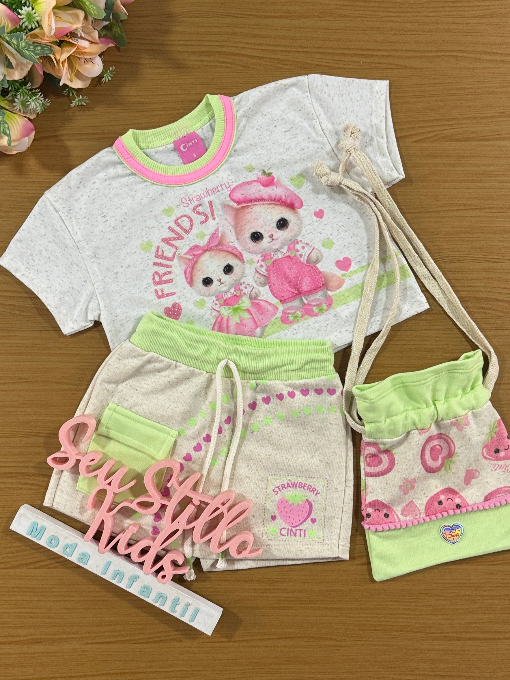 Conjunto Infantil Cinti Verão Shorts Saia e Blusa Verde Moranguinho com Bolsa