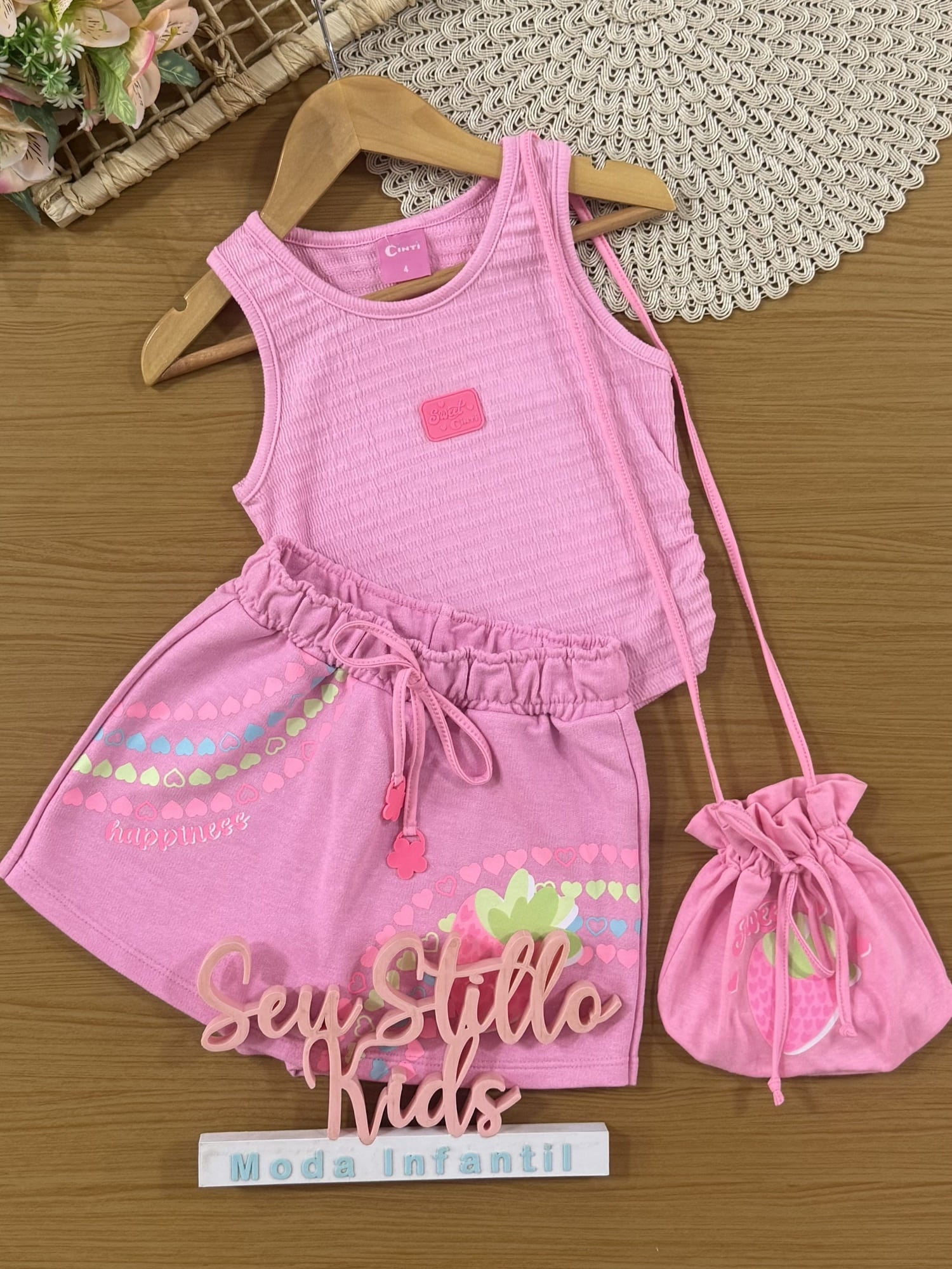 Conjunto Infantil Cinti Verão, Shorts Saia e Regata Rosa com Bolsinha