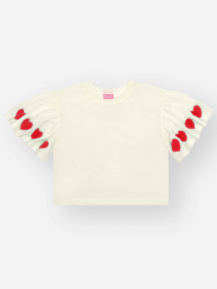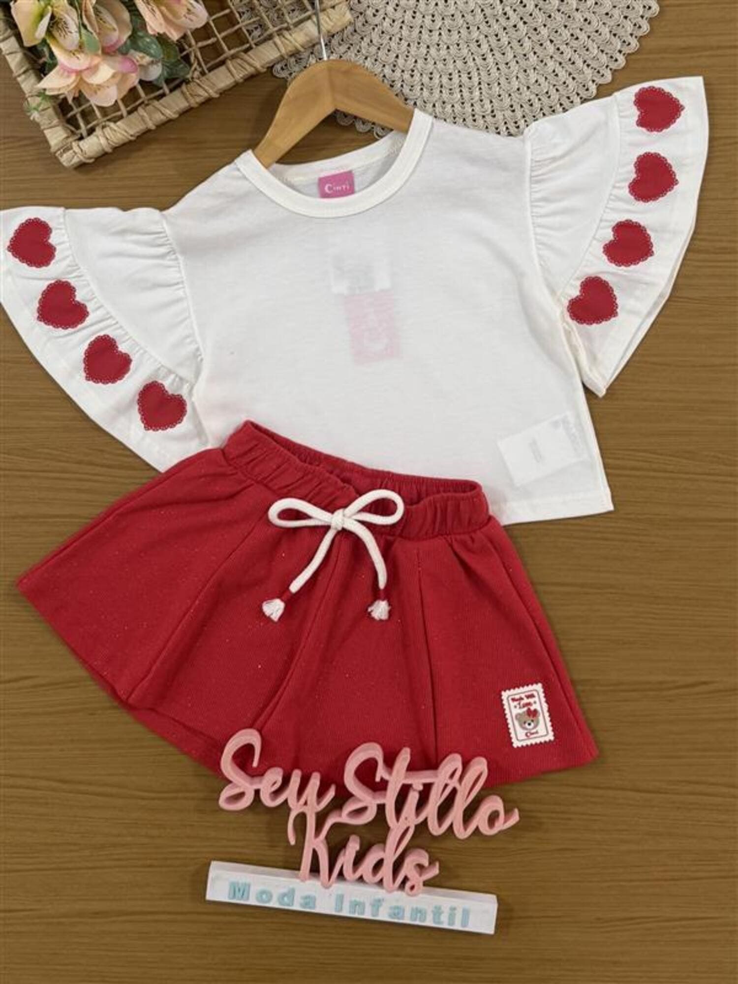Conjunto Infantil Cinti Verão Shorts Vermelho com Brilho e Blusa Branca Corações