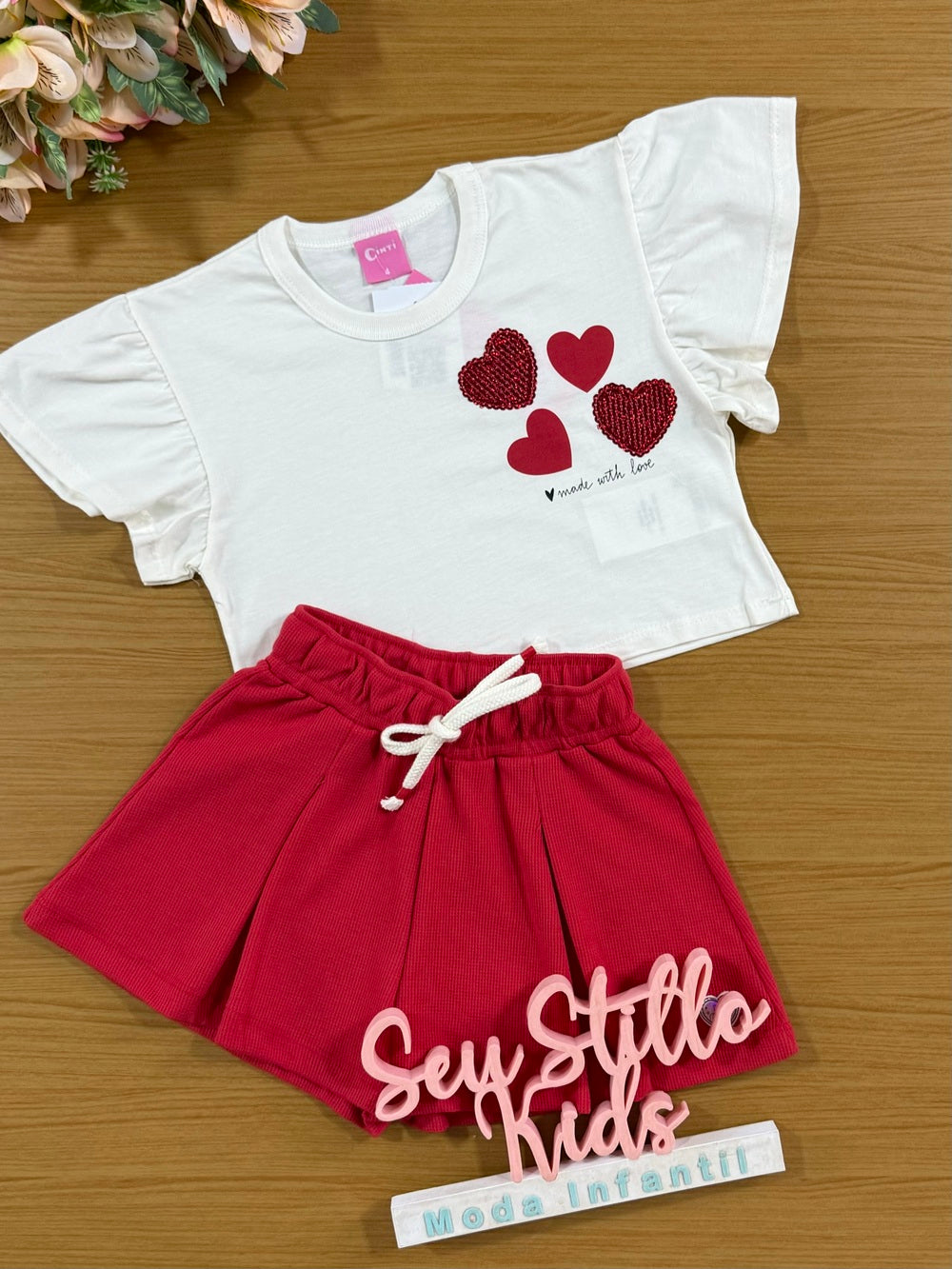 Conjunto Infantil Cinti Verão Shorts Vermelho e Blusa Corações