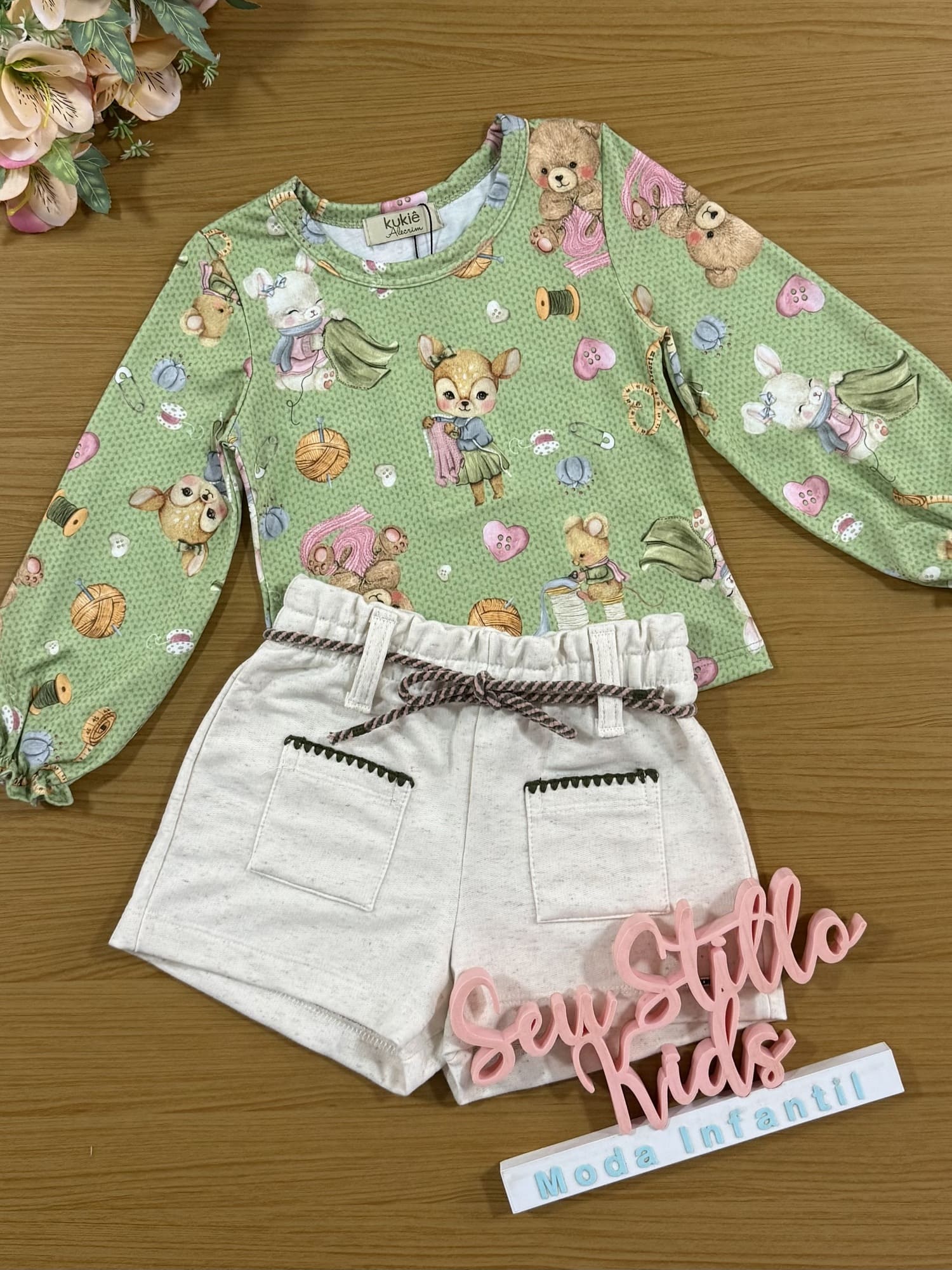 Conjunto Infantil Kukiê Alecrim Inverno com Shorts Off White e Blusa Verde Animais
