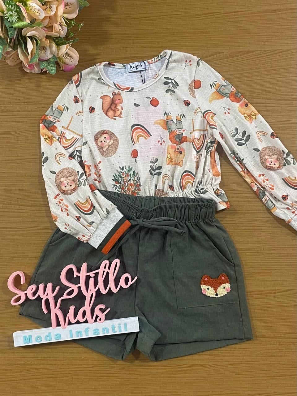 Conjunto Infantil Kukie Alecrim Inverno Shorts e Blusa Manga Longa Bichinhos