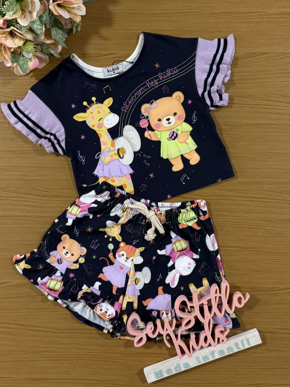 Conjunto Infantil Kukie Alecrim Verão Shorts e Blusa Azul Animais Musical
