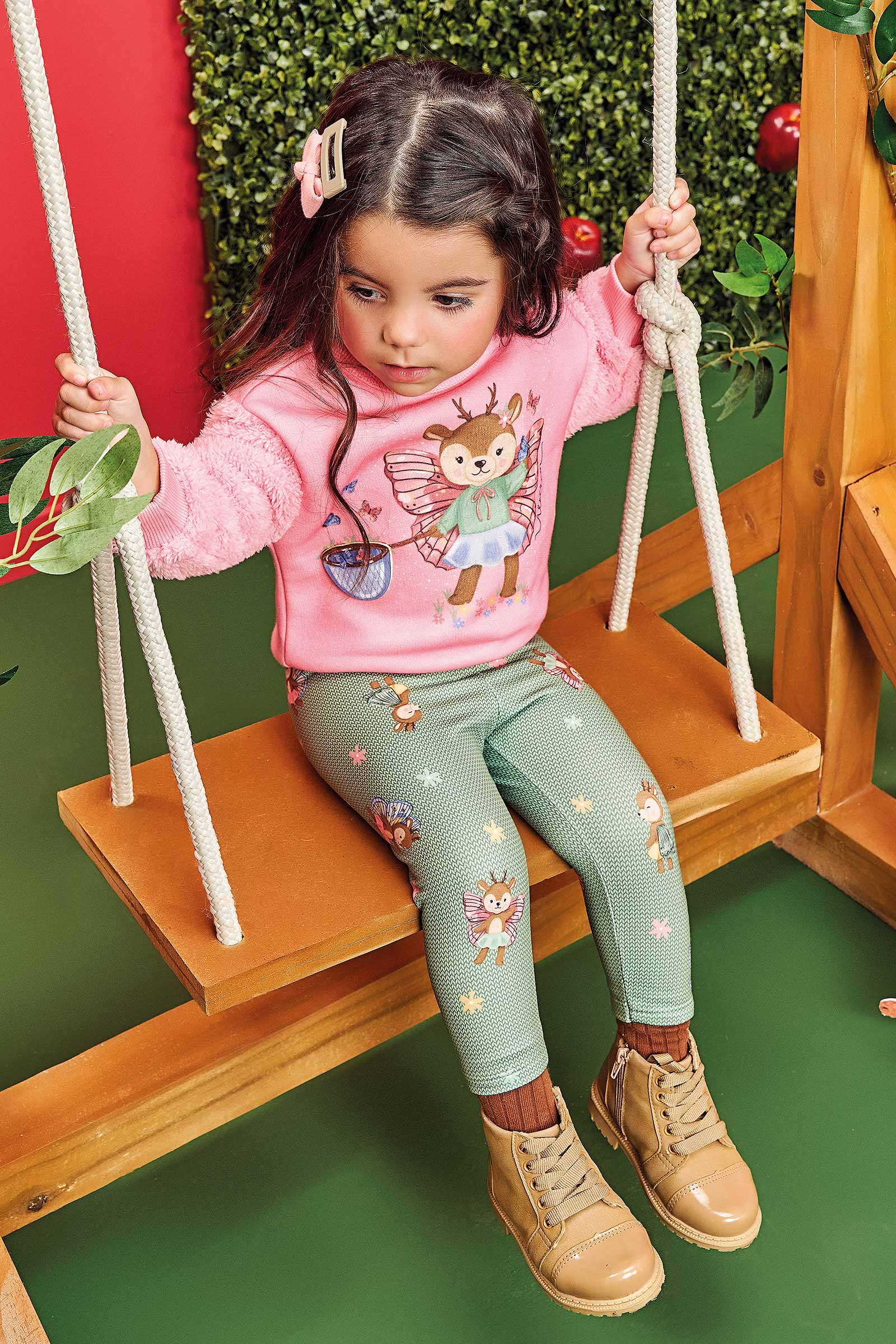 O Conjunto Infantil Kukie possui Blusão de gola redonda, mangas longas em pelo carneirinho, estampa frontal lúdica. Calça Legging em tecido térmico com elástico na cintura e toda estampada.