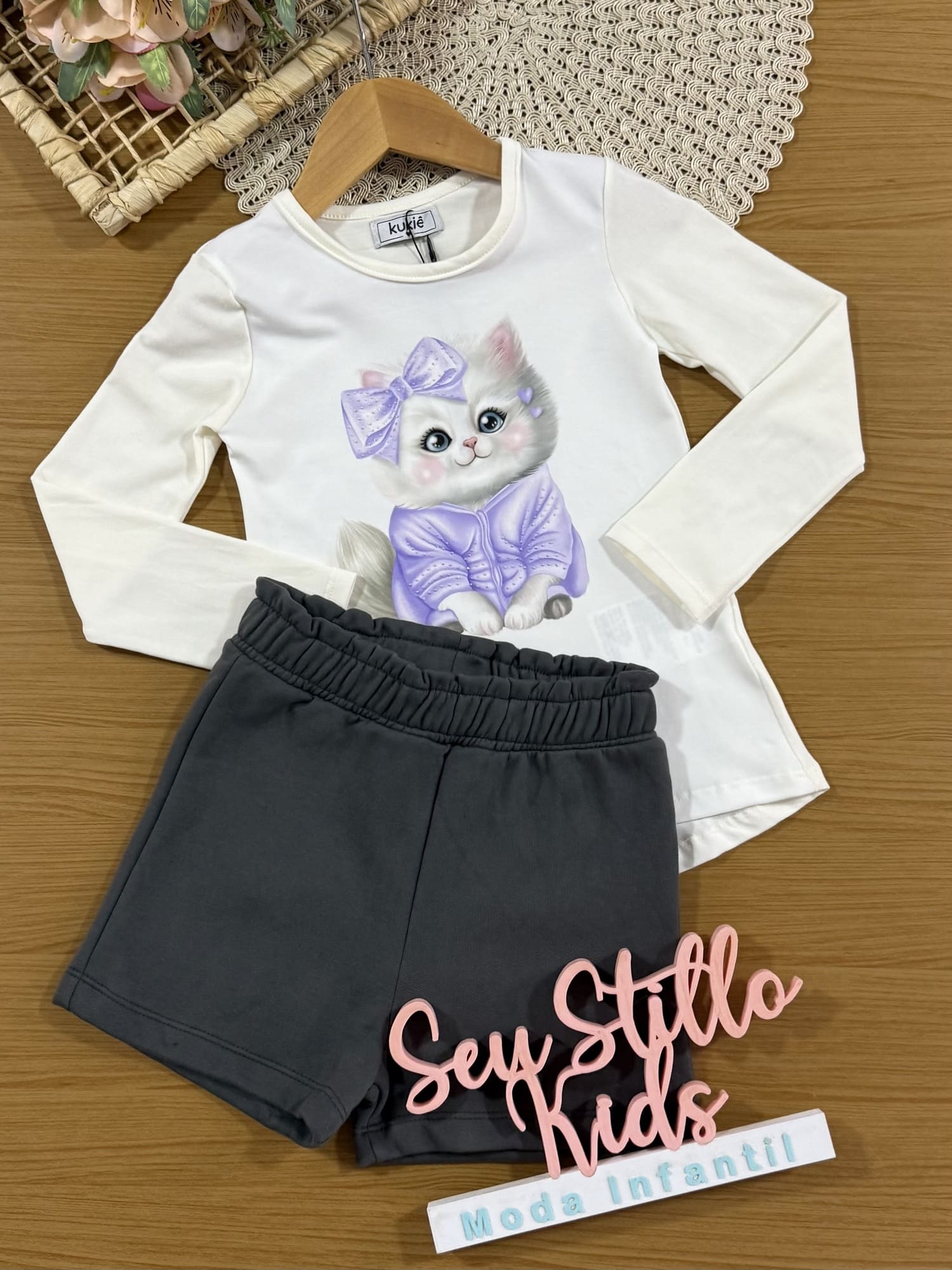 Conjunto Infantil Kukiê com Shorts Cinza e Blusa Manga Curta Gatinha