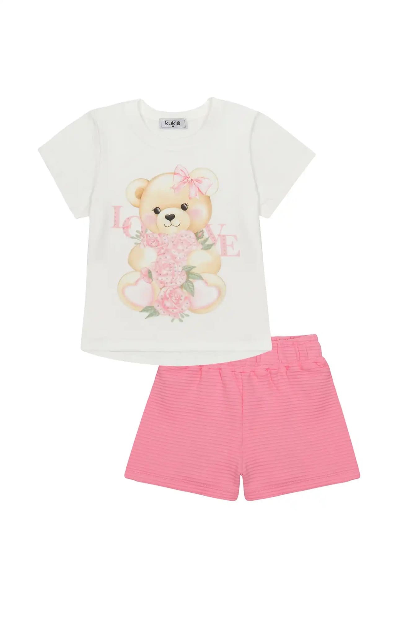 Conjunto Infantil Kukiê com Shorts Rosa e Blusa Manga Curta Ursinha Love