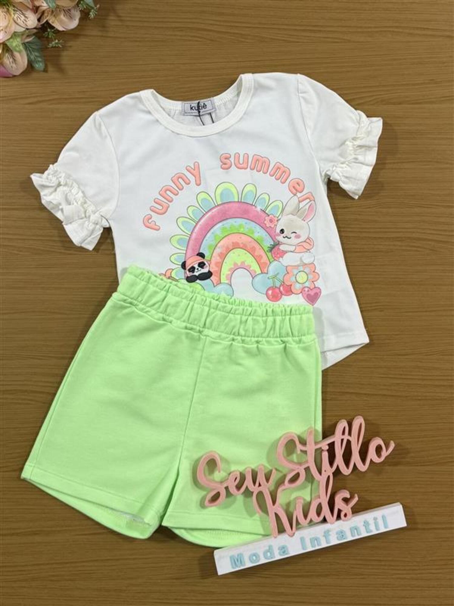 Conjunto Infantil Kukiê com Shorts Verde Neon e Blusa Manga Curta Frutinhas