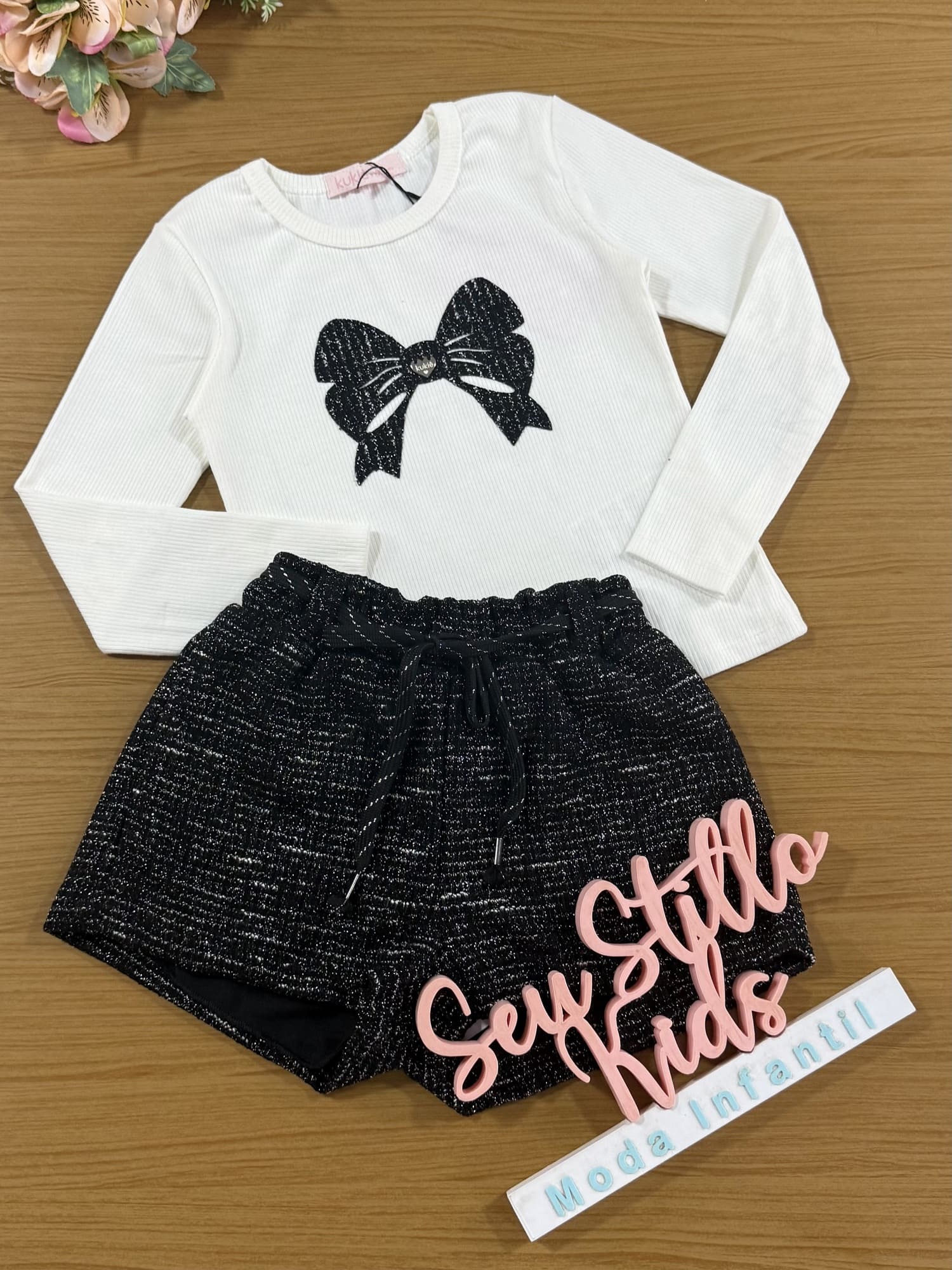Conjunto Infantil Kukiê Inverno com Shorts Preto e Blusa Manga Longa Laço