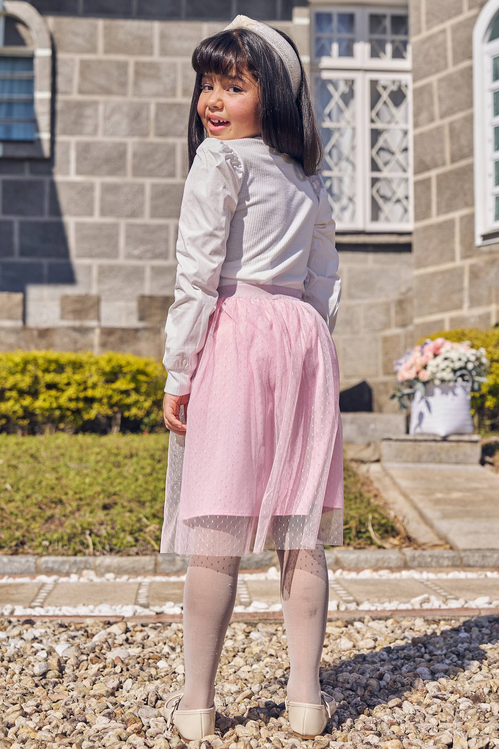 O Conjunto Infantil Kukie Inverno é composto por blusa em malha canelada com gola redonda e mangas longas em tricoline, linda estampa frontal. Saia em tule com poá, elástico na cintura com brilho e shorts embutido.