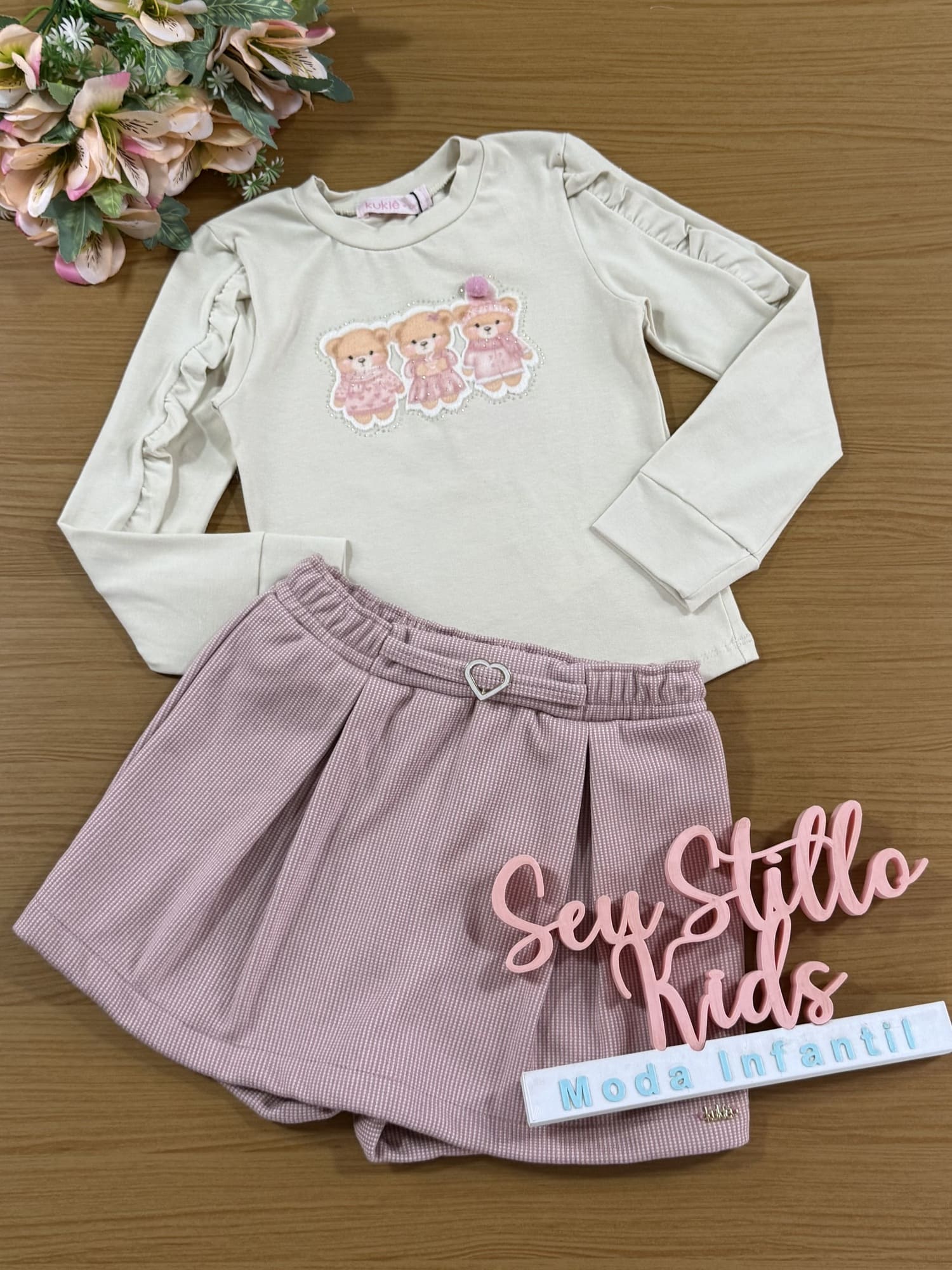 Conjunto Infantil Kukiê Inverno Short Saia e Blusa Bege Ursinhos