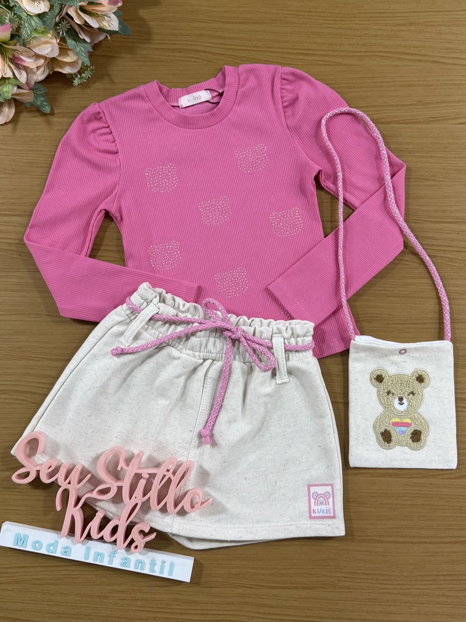 Conjunto Infantil Kukiê Inverno Short Saia e Blusa Rosa Brilhos com Bolsinha