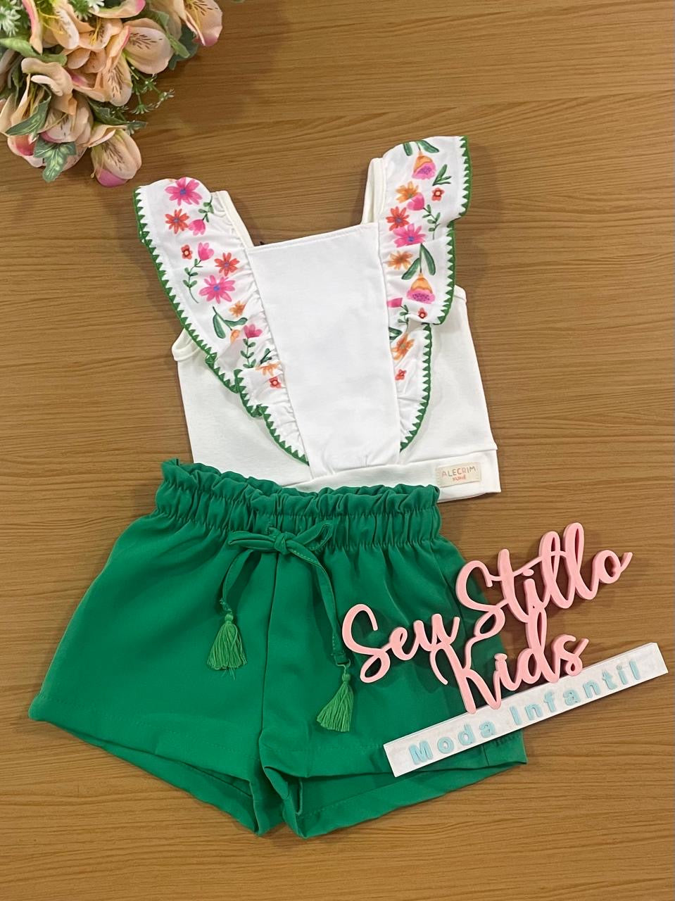 Conjunto Infantil Kukie Tropical Shorts e Blusa Branca Flores