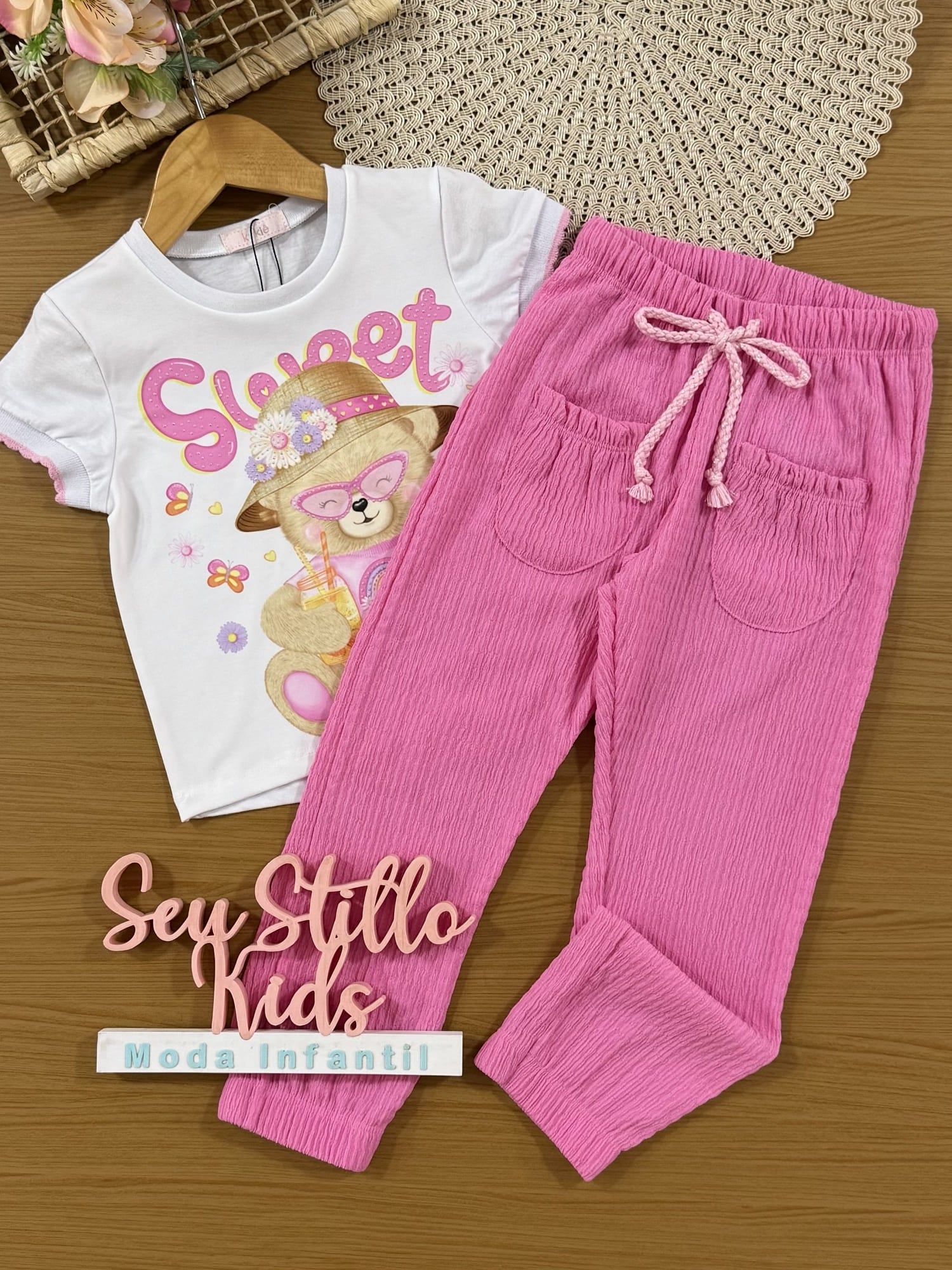 Conjunto Infantil Kukiê Verão com Calça Rosa e Blusa Branca Ursinha Sweet