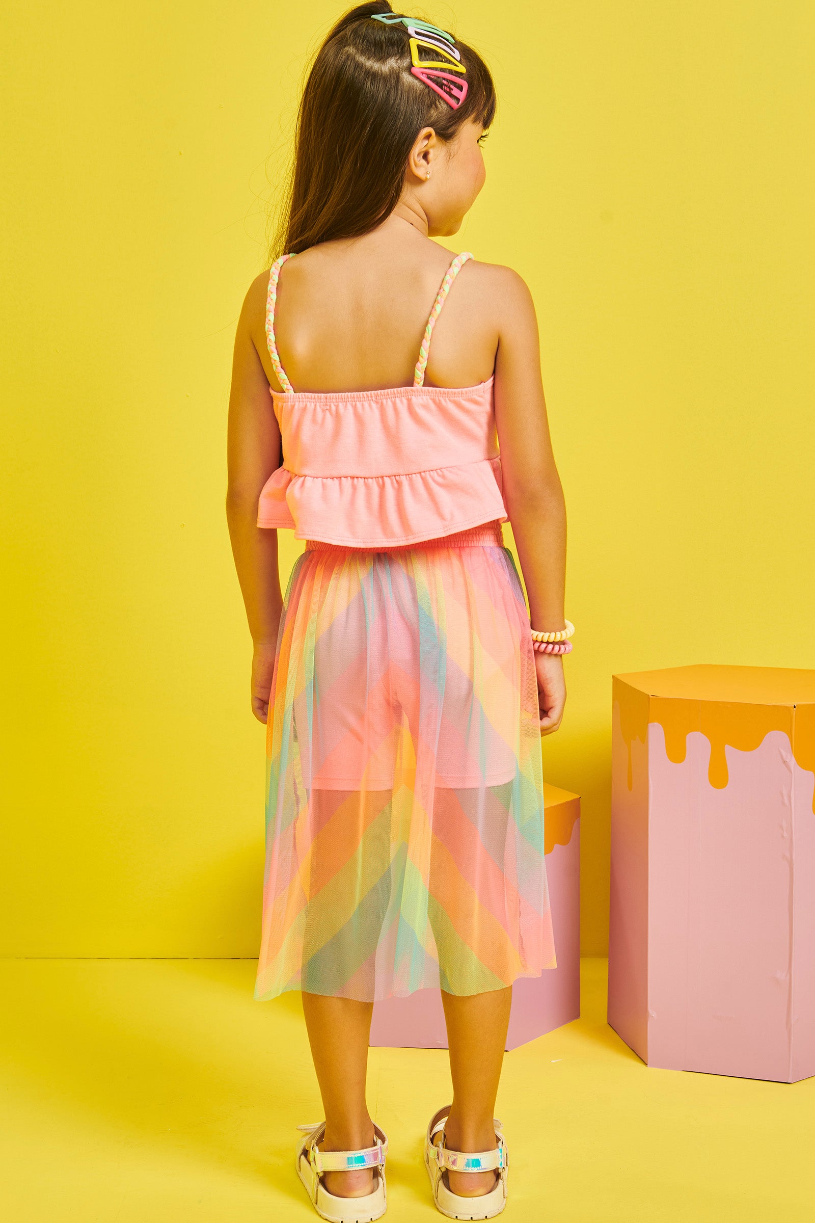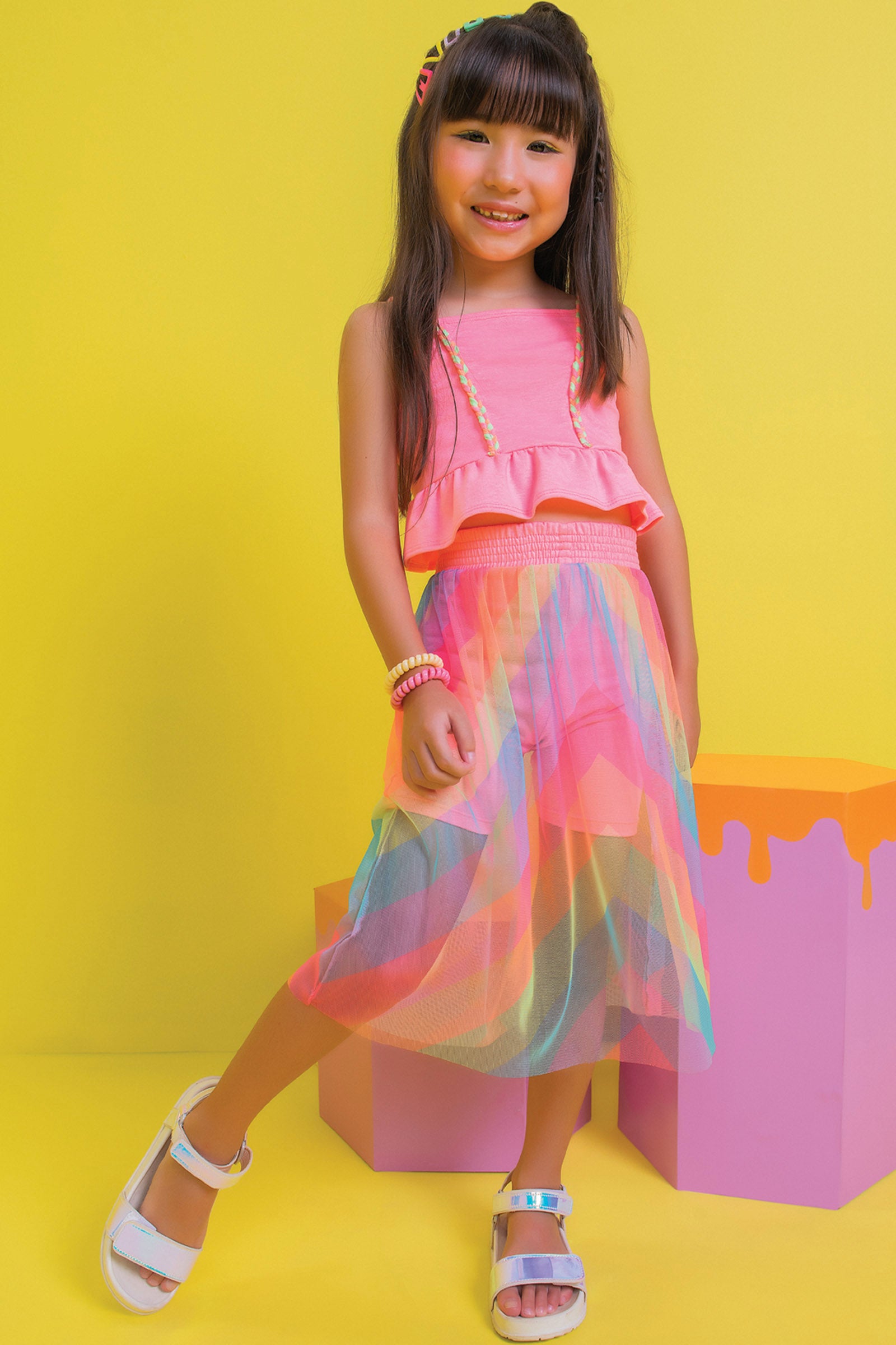 Conjunto Infantil Kukie Verão Com Saia em Tule Colorido Blusa Rosa Neon
