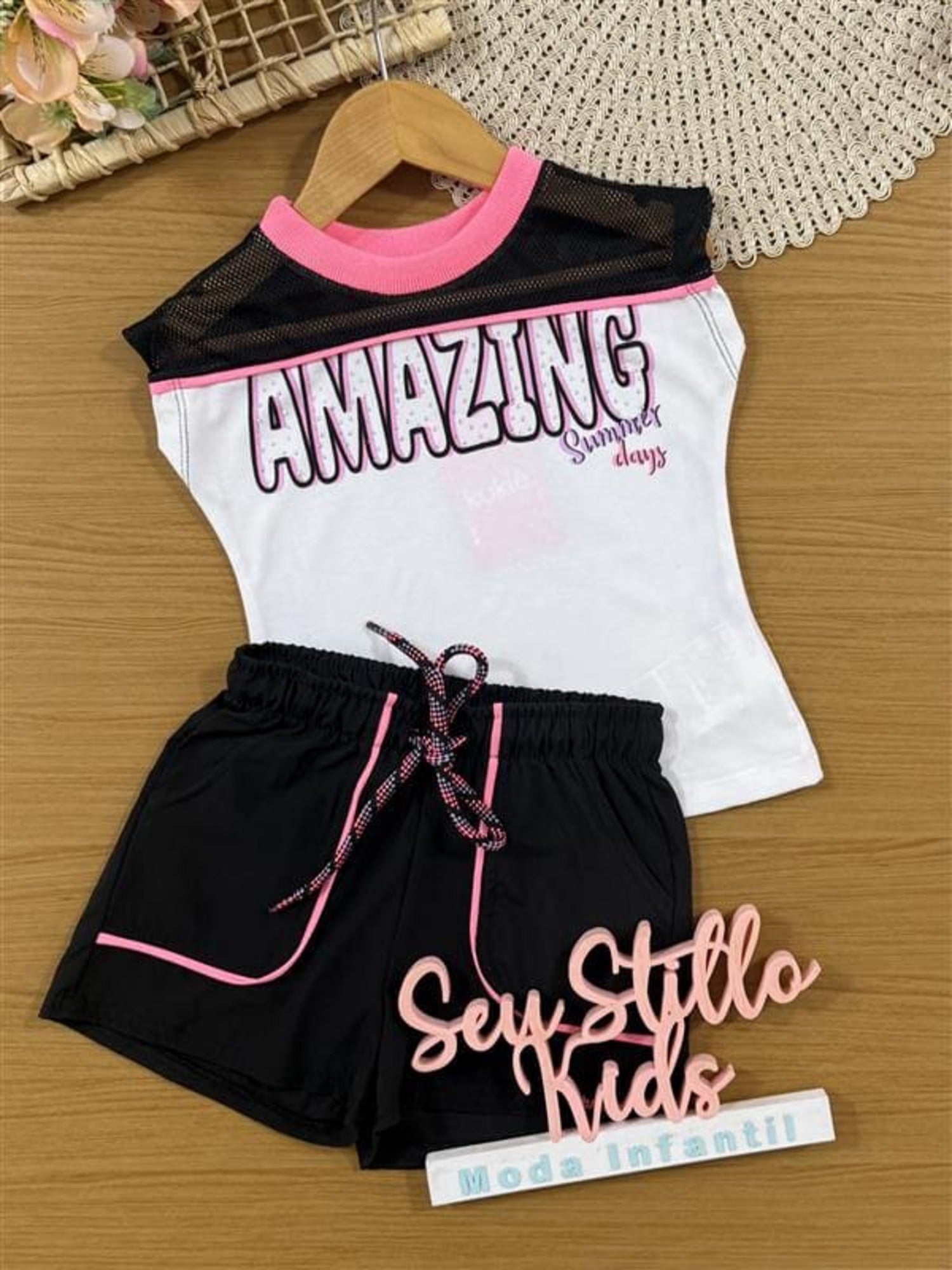 Conjunto Infantil Kukiê Verão com Short Preto e Blusa Branca com Strass Fashion