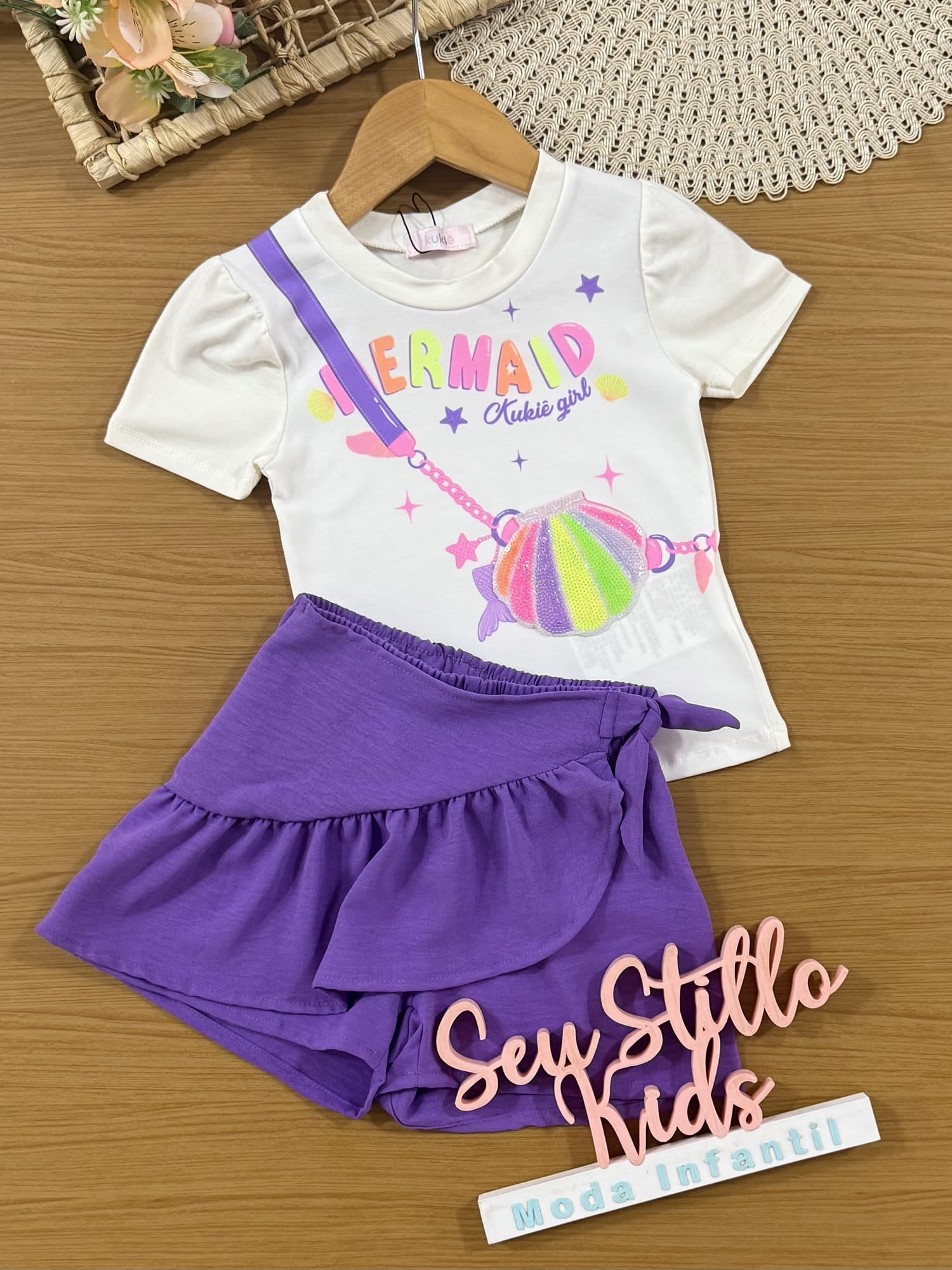Conjunto Infantil Kukiê Verão com Short-Saia Roxo e Blusa Branca Mermaid