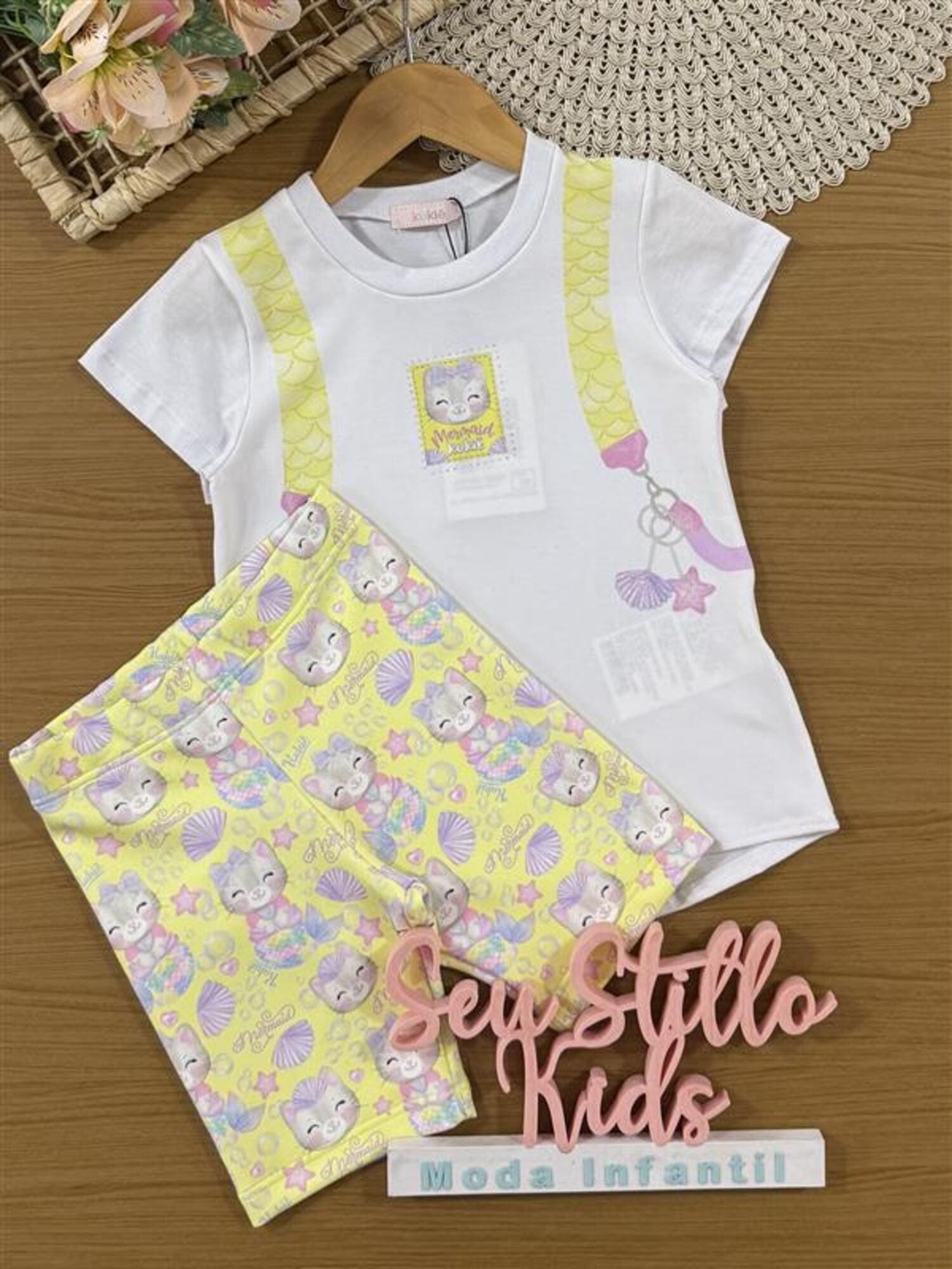 Conjunto Infantil Kukiê Verão com Shorts Ciclista Amarelo e Blusa Branca Gatinha Mochilinha