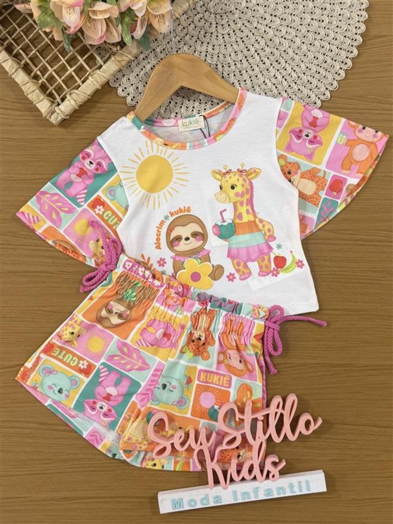 Conjunto Infantil Kukiê Verão com Shorts e Blusa Branca Animais