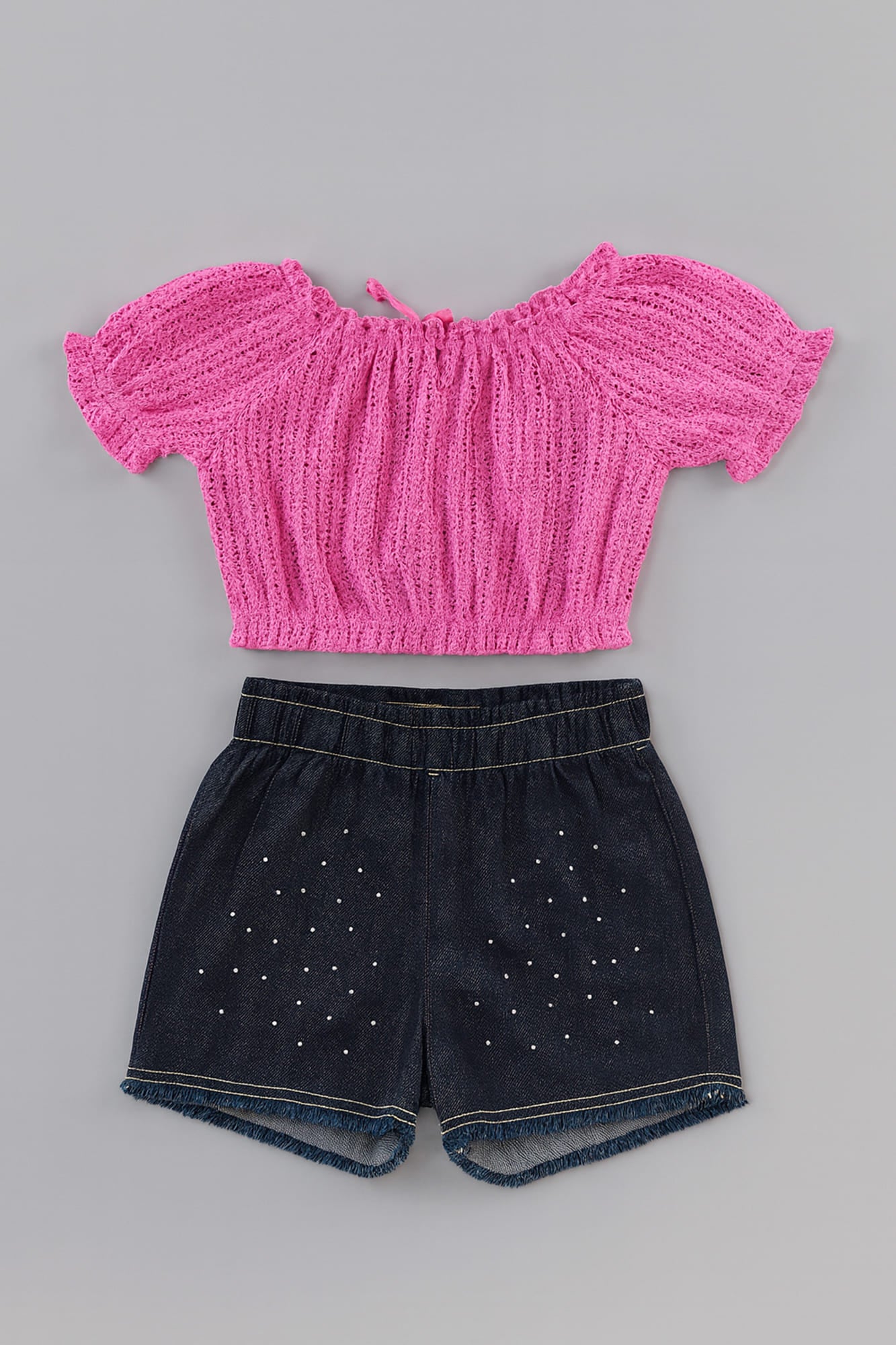 Conjunto Infantil Kukiê Verão com Shorts Jeans Preto e Blusa Rosa Trico