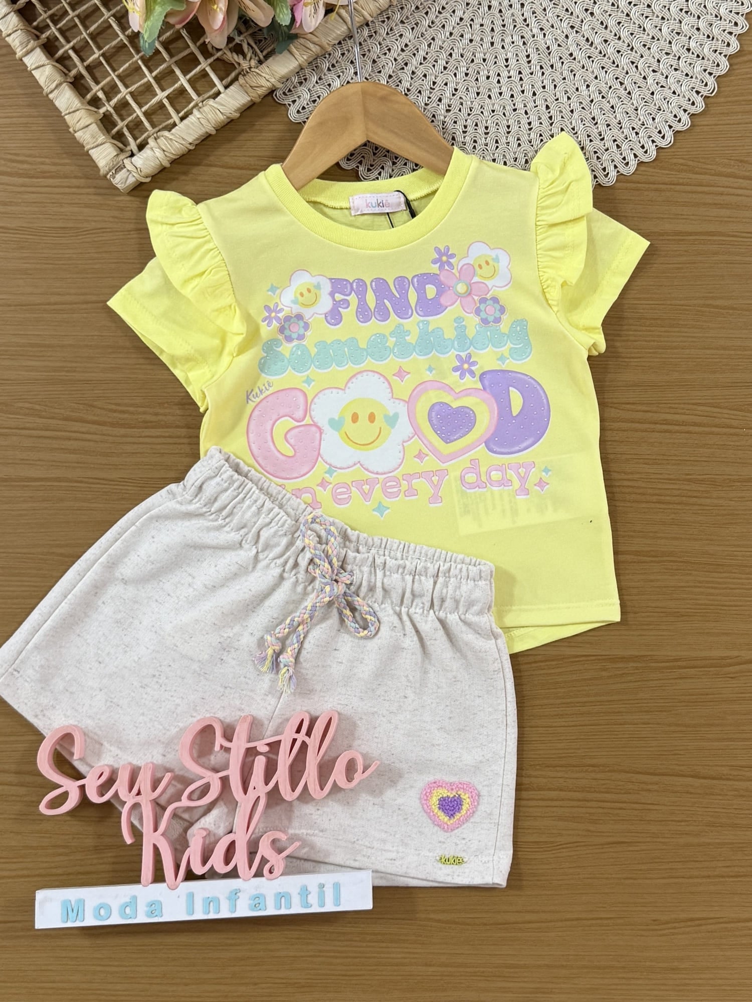 Conjunto Infantil Kukiê Verão com Shorts Off White e Blusa Amarela Florzinha