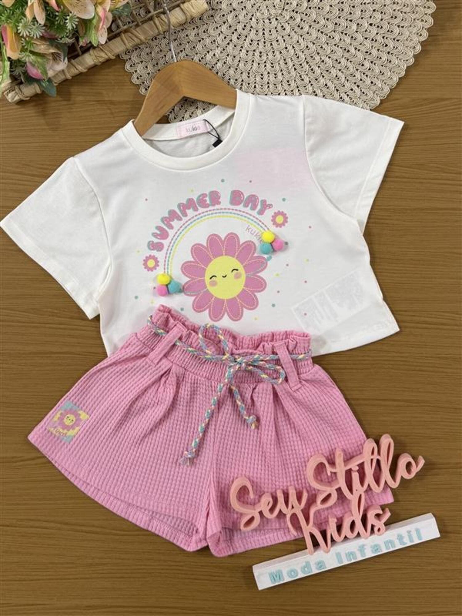 Conjunto Infantil Kukiê Verão com Shorts Rosa e Blusa Branca Florzinha Arco-irís