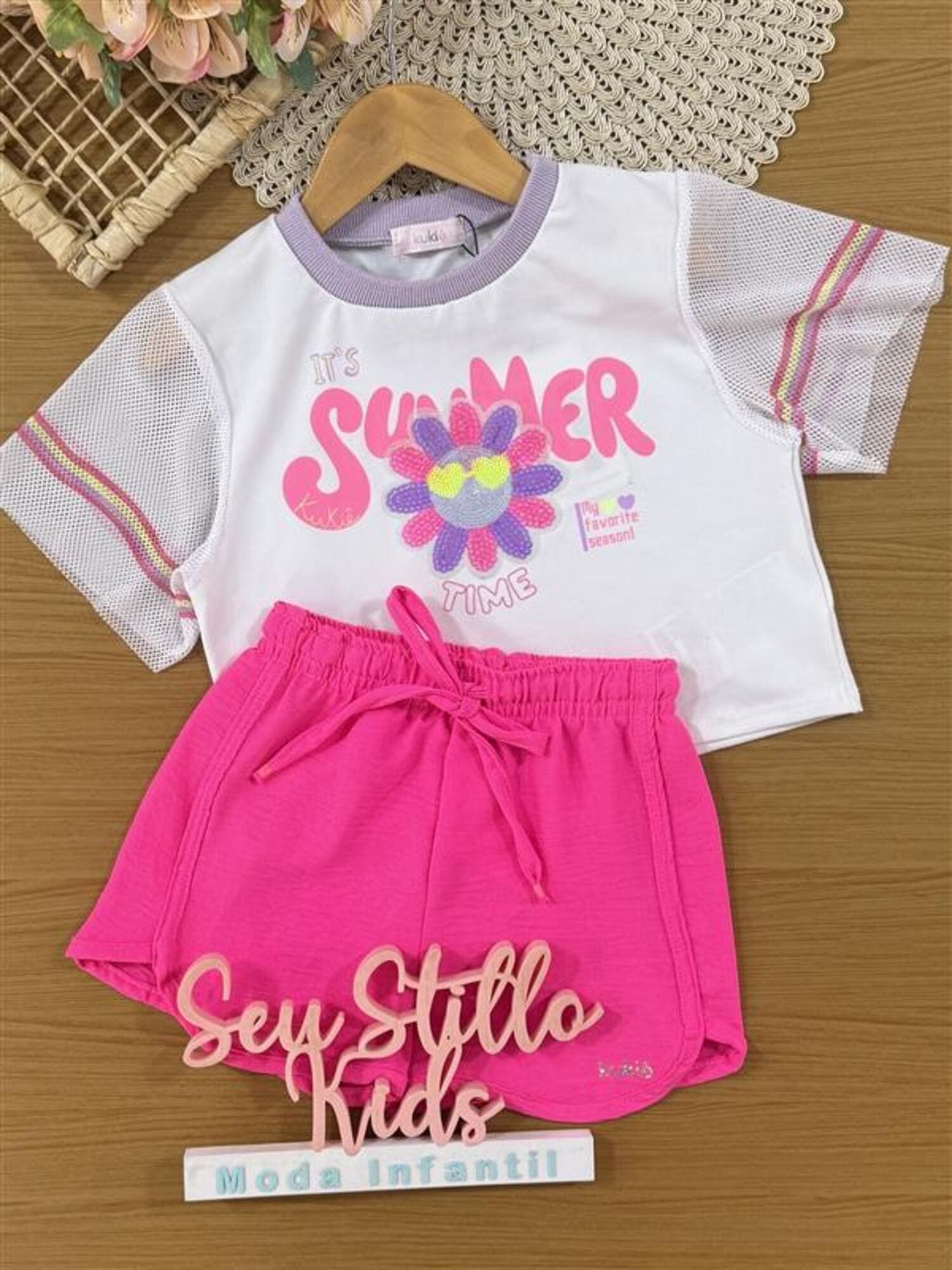 Conjunto Infantil Kukiê Verão com Shorts Rosa e Blusa Branca Summer