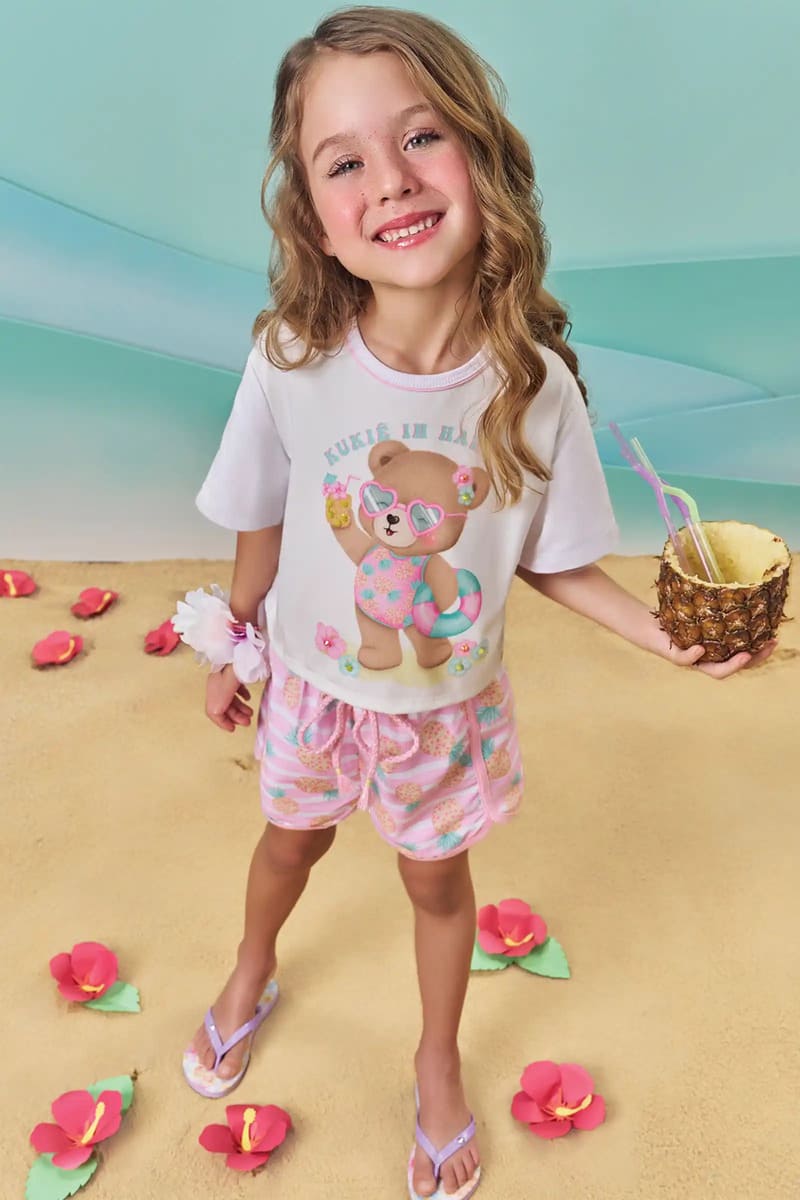Conjunto Infantil Kukiê Verão com Shorts Rosa e Blusa Branca Ursinha na Praia