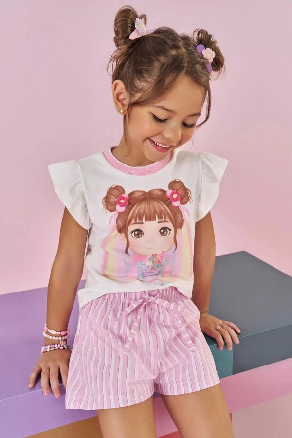 Conjunto Infantil Kukiê Verão com Shorts Rosa Listrado e Blusa Branca Menina Arco-íris