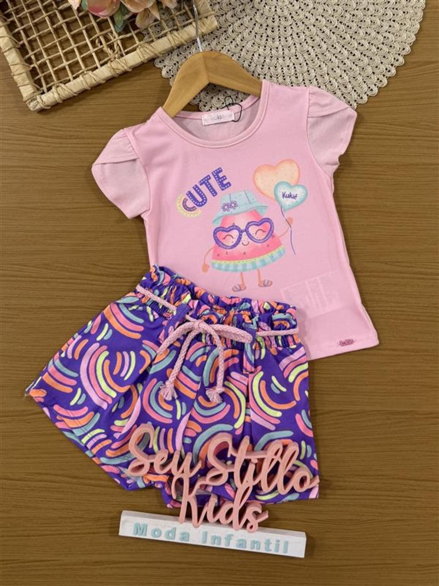 Conjunto Infantil Kukiê Verão com Shorts Roxo e Blusa Rosa Frutinha Cute