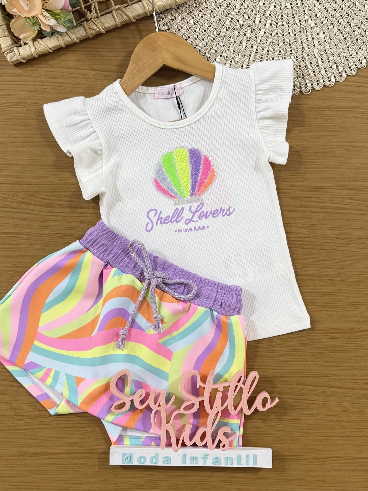 Conjunto Infantil Kukiê Verão com Shorts Saia Colorido e Blusa Branca Concha