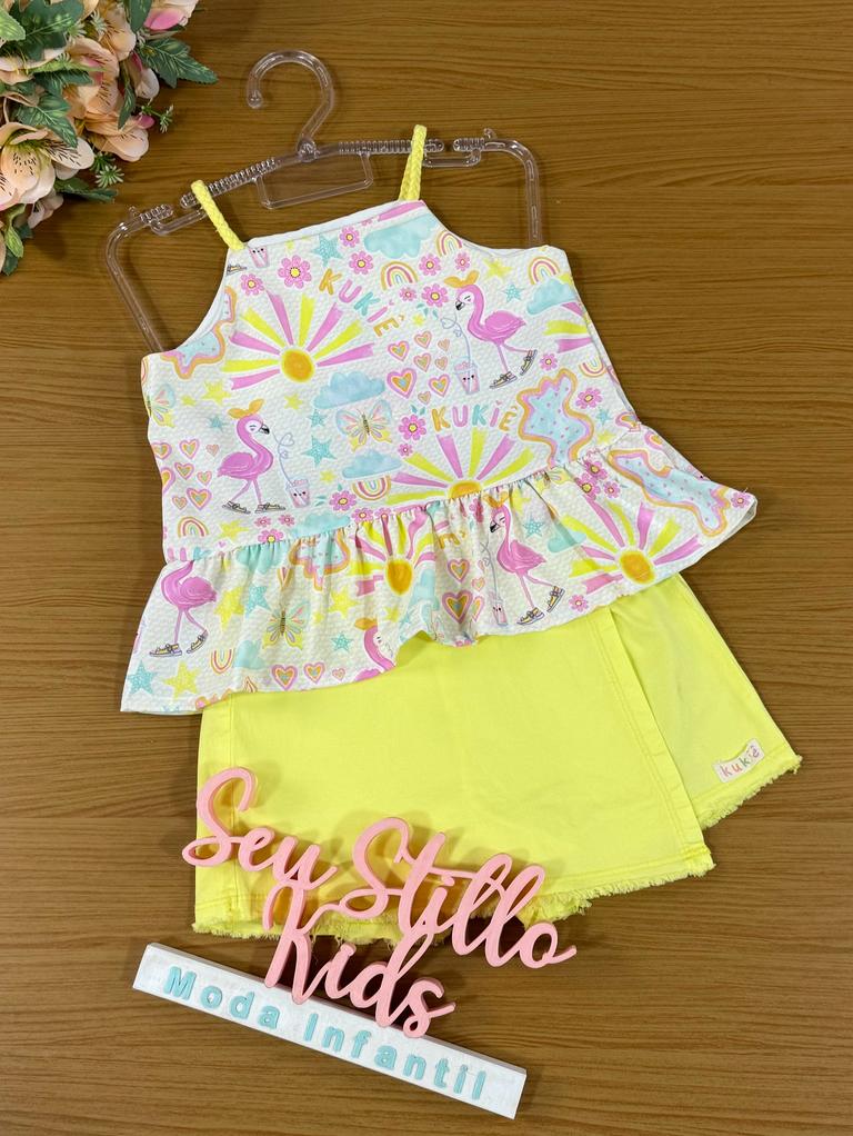 Conjunto Infantil Kukie Verão Com Shorts Saia e Blusa Flamingo