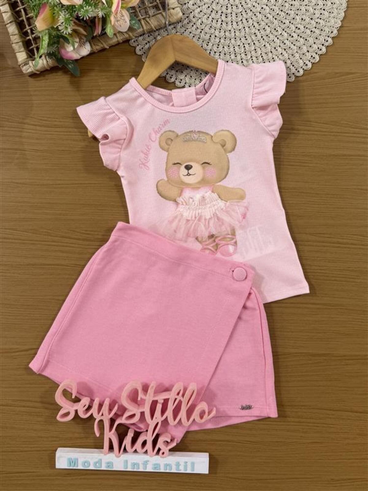 Conjunto Infantil Kukiê Verão com Shorts Saia e Blusa Rosa Ursinha Bailarina