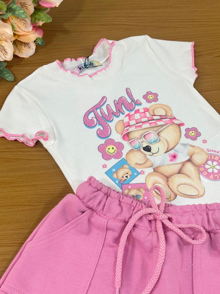 Conjunto Infantil Kukie Verão Com Shorts Saia Rosa e Blusa Branca Ursinha Fun